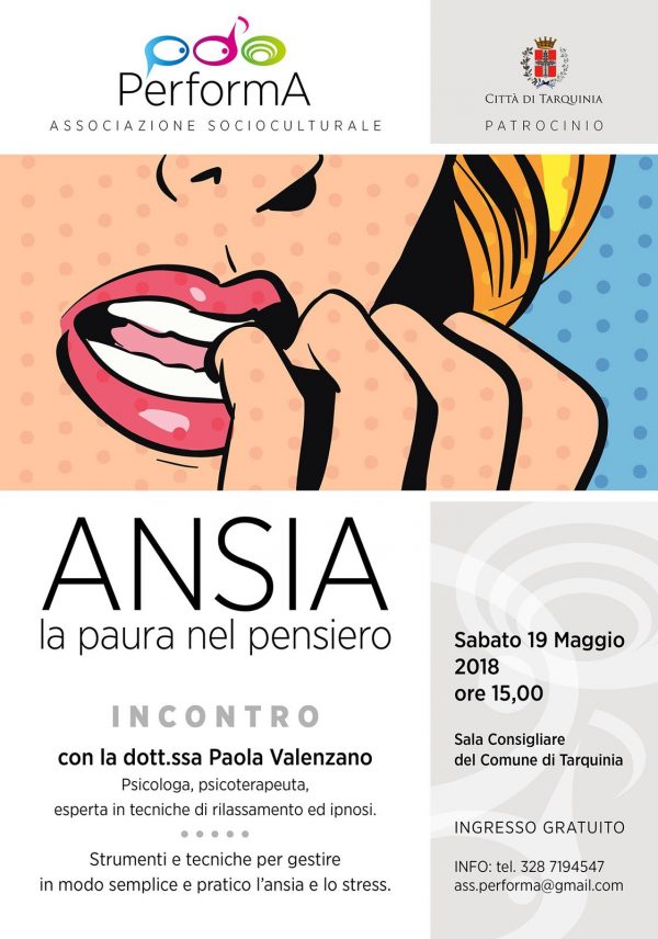 “Ansia, la paura nel pensiero”: è questo il titolo dell’incontro, in programma il prossimo 19 maggio, sabato, alle ore 15, presso la sala consiliare del Comune di Tarquinia, con la dott.ssa Paola Valenzano, psicologa, psicoterapeuta ed esperta in tecniche di rilassamento ed ipnosi.