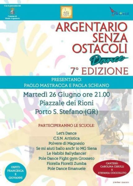 A dare inizio alle rassegne saranno il gruppo Argentario Senza Ostacoli e la Pro Loco di Porto Santo Stefano che, con il patrocinio del Comune di Monte Argentario, mettono in scena, martedì 26 giugno 2018 alle ore 21,00 la 7° edizione di “Argentario Senza Ostacoli Dance”. Presentate da Paolo Mastracca e Paola Sclano, parteciperanno le scuole: Let’s Dance, C.S.N. Artistica, Polvere di Magnesio, Se mi aiuti ballo anch’io MG Siena, le Habibi Ballydancer, Pole Dance Fight gym Grosseto, Fiorella Fiorelli Zumba e Pole Dance Emanuele. Canteranno Carolina Cerulli e Stefania Coccoluto, ospiti Francesca e Giovanni.