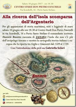 “Alla ricerca dell’isola scomparsa dell’Argentario”, questo il titolo della conferenza, ruoterà attorno ai numerosi miti e leggende che si sono create negli anni sull’isola di Zanara al cui riguardo il comandante Busetto mostrerà la cartografia storica italiana ed europea che la riporta tra Giglio e Giannutri dal 1589 al 1720. L’introduzione sarà affidata alla professoressa Gabriella Solari.