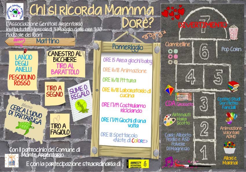 “Chi si ricorda Mamma Dorè?”. Il titolo dell’evento organizzato sul piazzale dei Rioni a Porto S.Stefano dall’Associazione Genitori Argentario mercoledì 31 maggio 2017 riporta alla vecchia filastrocca per evidenziare l’intento di tornare ai giochi che facevano divertire i bambini fino a qualche decennio fa. Così, dalle ore 9.30 fino alle 20.00 circa, sarà un susseguirsi di intrattenimenti per tutti i gusti.
