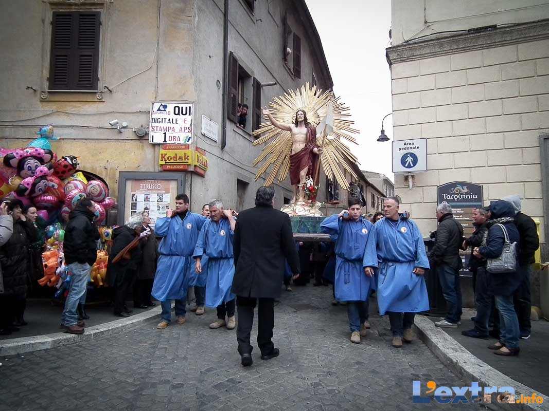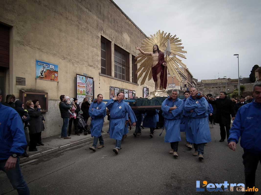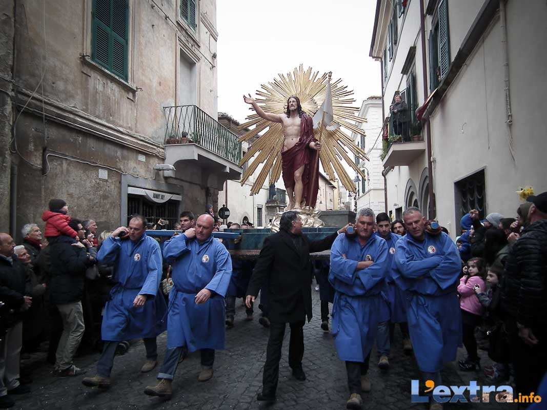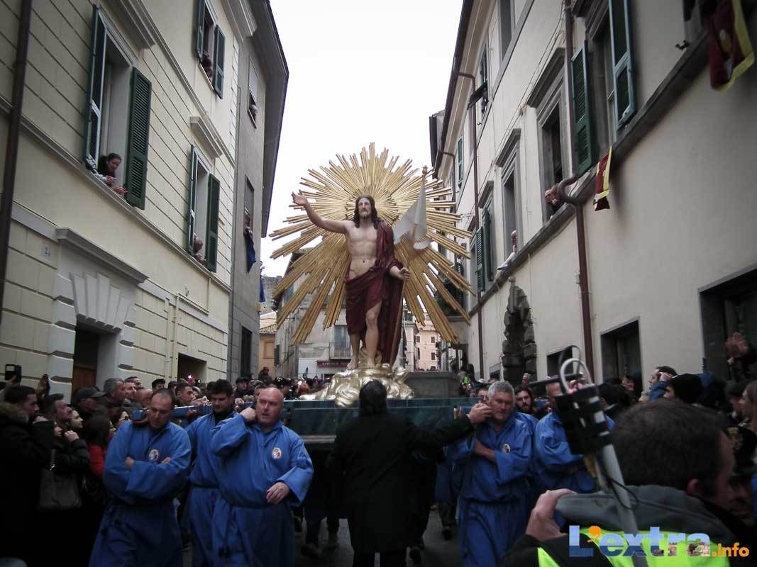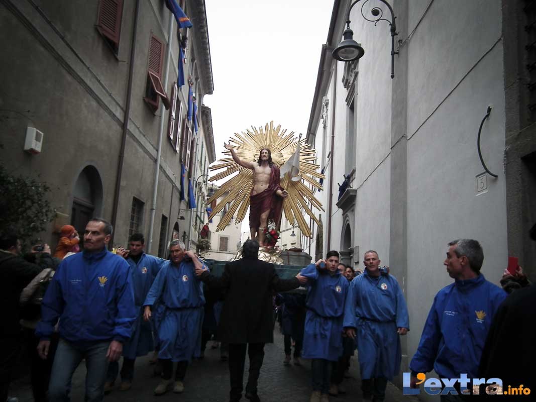 Il Cristo Risorto anche oggi, 5 aprile 2015, in una giornata pessima dal punto di vista del maltempo, ha emozionato Tarquinia lunga la sua corsa: fermatasi, per la parentesi necessaria alla processione, la pioggia, è stato il vento a creare qualche disagio, soprattutto ai portatori dei tronchi. Ed è stato splendido, a tal proposito, il sostegno dei tanti spettatori assiepati lungo il percorso, che hanno sospinto ed applaudito i protagonisti soprattutto nei momenti di difficoltà.