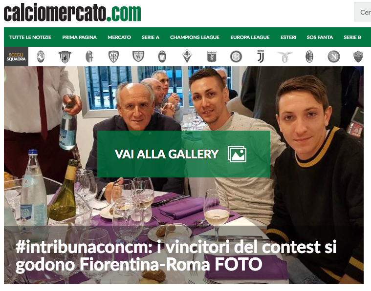 In particolare, a vincere il premio messo in palio dal noto sito d’informazione calcistica calciomercato.com è stato Costantino Amitrului, che nella scorse settimane ha – come da regolamento – postato un video con l’hashtag #intribunaconcm: video selezionato tra i vincitori del contest settinamale, che ha perciò consentito a lui ed all’amico Marco Fabiani di godersi lo spettacolare match di Firenze come ospiti.