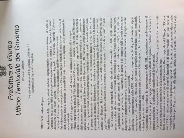 Soluzione, quella adottata dall’azienda, che appare in evidente contrasto con l’impegno assunto in Prefettura, il 14 gennaio scorso, dal proprio rappresentante Massimo Maienza – nelle immagini sotto il testo integrale del verbale della seduta – che, pur già consapevole della perdita di concorrenzialità del punto vendita, tanto da manifestare l’intenzione di trovare un acquirente, garantiva di fronte al Vice Prefetto Aggiunto Andrea Nino Caputo il rispetto dei due punti fermi indicati dal Vice Prefetto stesso: cioè la definizione di percorsi riconoscibili per la ricerca di eventuali compratori e l’impegno nella ricerca di soluzioni per tutti i dipendenti.