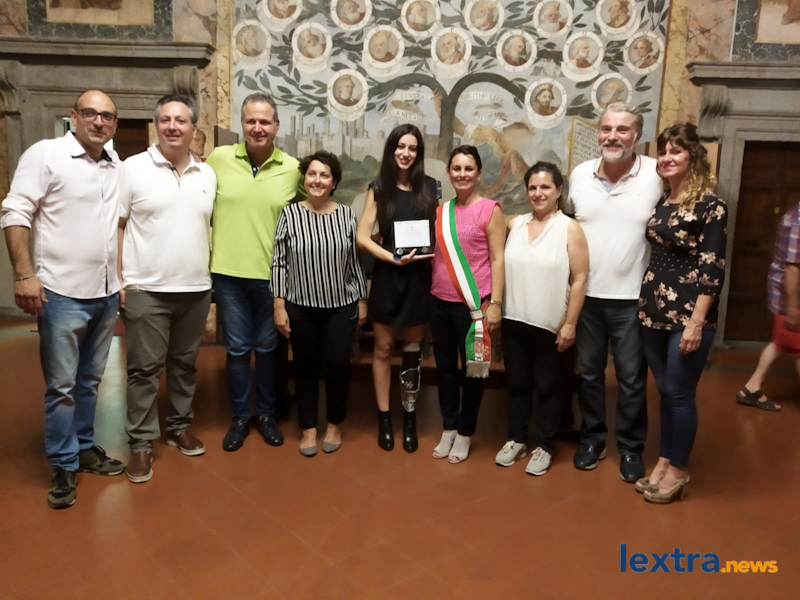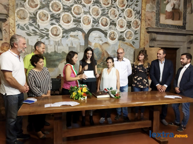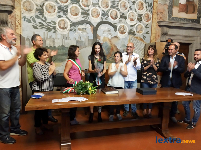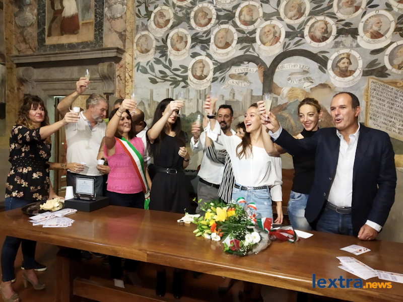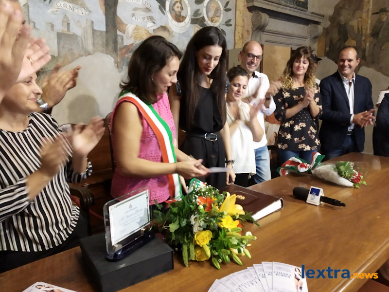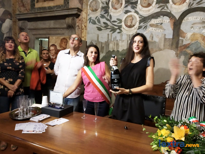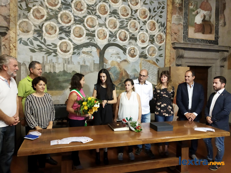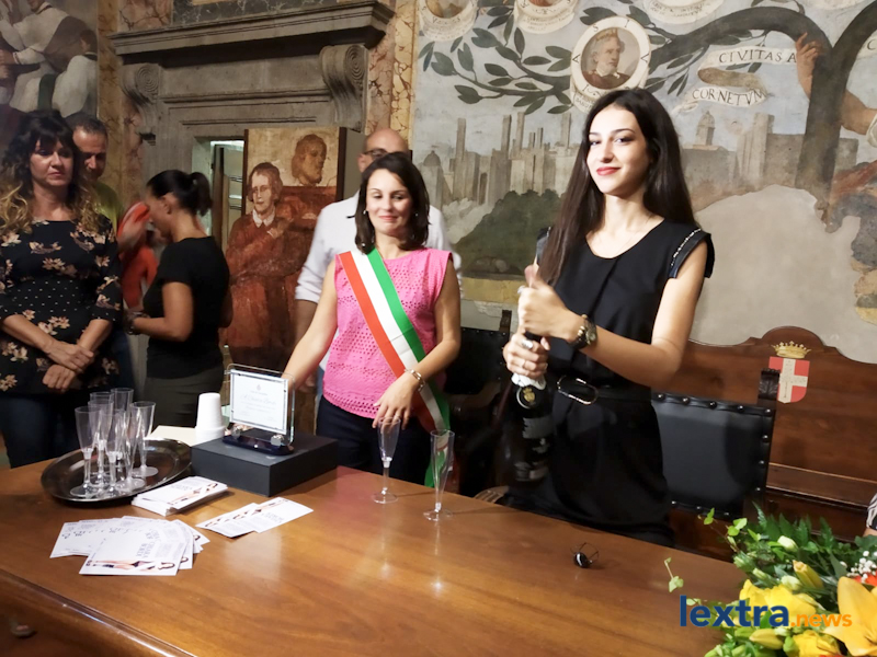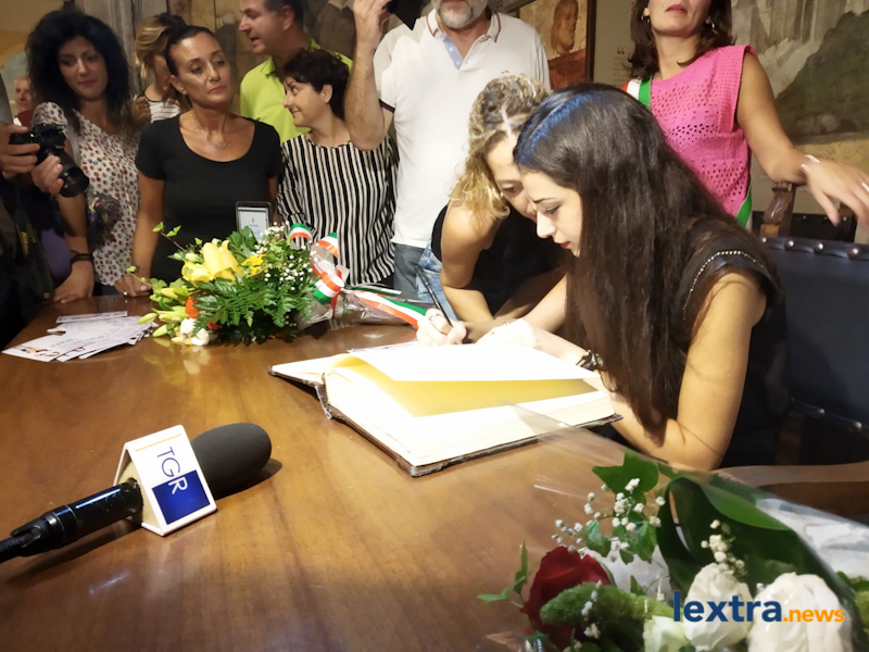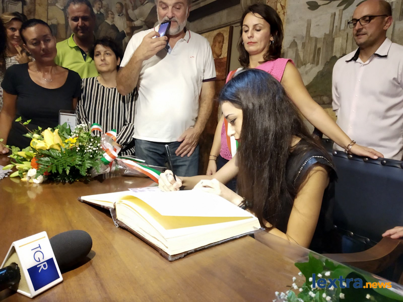 Giunta in cabriolet in piazza Matteotti, ad accoglierla ha trovato amici, parenti e concittadini felici di salutarla, oltre all’amministrazione comunale che l’ha omaggiata con una targa. Tanti palloncini bianchi, un brindisi poi tutti in sala degli affreschi per salutare la Miss, che ha parlato telefonicamente con il sindaco Mencarini e firmato il libro che riporta le dediche delle personalità che vengono ricevute al palazzo comunale.