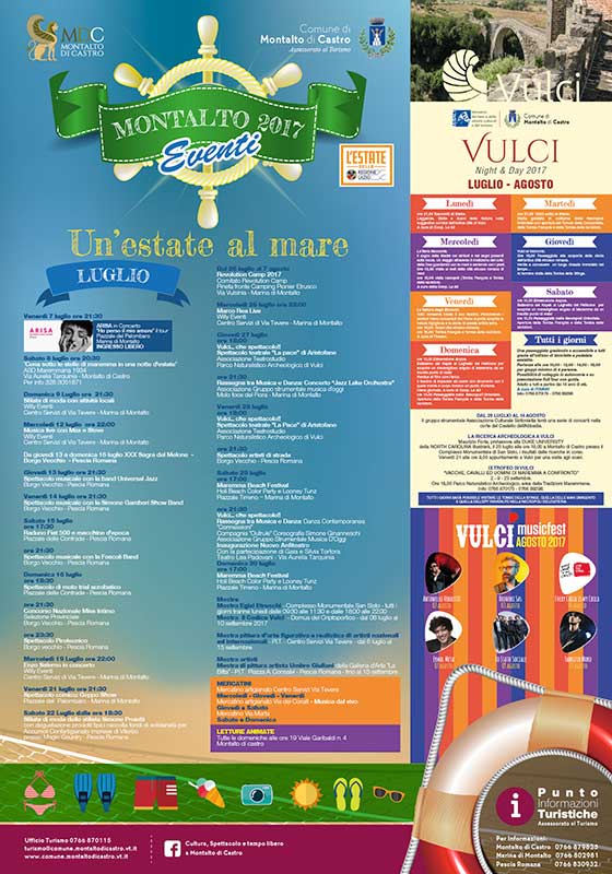 A Montalto Marina, mercoledì 19, alle 22, Enzo Salerno in concerto con la Willy Eventi presso il Centro servizi di via Tevere; venerdì 21, alle 21:30 (Piazzale del Palombaro), si terrà lo spettacolo comico “Geppo Show”; sabato 22, alle 18:30 (presso Magic Country-Pescia Romana), la sfilata di moda dello stilista Simone Proietti con degustazione di prodotti tipici. All’evento la raccolta fondi di solidarietà per Accumuli, con la collaborazione di Confartigianato Imprese Viterbo. Dal 26 luglio al 7 agosto, presso la pineta antistante il Camping Pioner Etrusco a Montalto Marina (via Vulsinia), si terrà “Revolution Camp 2017”: il villaggio studentesco pensato per gli studenti che hanno voglia di confrontarsi e scambiarsi opinioni ma soprattutto di divertirsi insieme dopo un anno passato sui libri.Mercoledì 26, alle 22 (Centro Servizi via Tevere-Montalto Marina), musica con Marco Rea Live; giovedì 27 e venerdì 28, alle 18, presso il parco di Vulci, l’appuntamento con lo spettacolo teatrale “La pace” di Aristofane con l’associazione Teatrostudio. Alle 21:30 di giovedì 27 luglio, al molo della foce del fiume Fiora a Montalto Marina, la rassegna tra Musica e Danza con il concerto “Jazz Lake Orchestra” dell’associazione Gruppo strumentale Musica d’Oggi.
