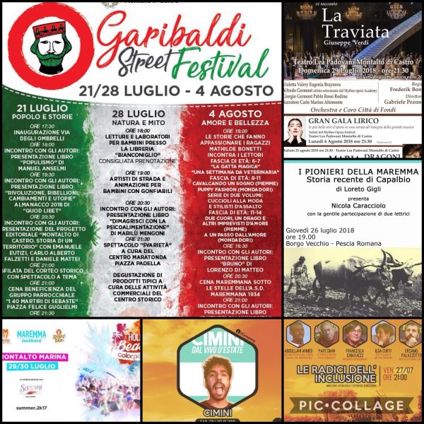 Sabato 28 ore 18:00 via Garibaldi Montalto, torna il Garibaldi Street Festival (Natura e Mito). Ore 18:00 presentazione del libro “Il giro della Tuscia in 80 giorni” ed incontro con l’autore Saverio Loperfido; ore 19:00 artisti di strada e animazione per bambini; ore 20:30 presentazione ed incontro con gli autori del libro “Dimagrisci con la psicoalimentazione” di Marilù Mengoni; ore 21:30 piazza Padella “SVARIETÀ” a cura del centro Maratonda; degustazione di prodotti tipici a cura delle attività commerciali del centro storico.
