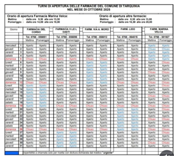 La tabella allegata elenca, giorno per giorno, le farmacie di Tarquinia attive in mattinata e nel pomeriggio, distinguendo le sedi del centro e delle frazioni; sono evidenziati i casi di chiusura e la reperibilità, così da individuare rapidamente il presidio disponibile nelle diverse fasce orarie.