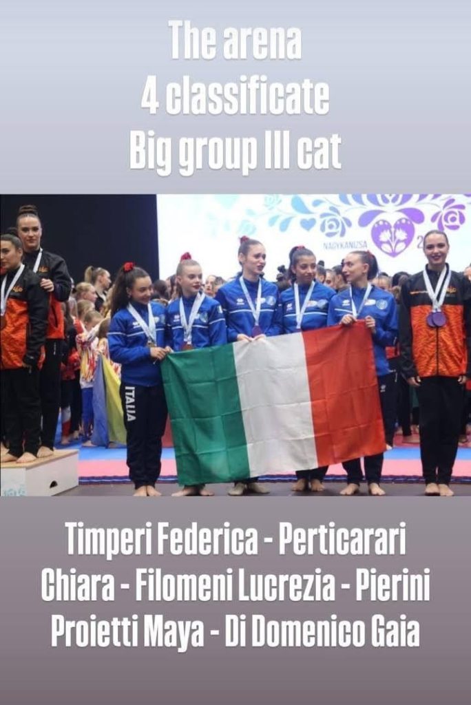 • Quarto posto, alle spalle di una Spagna estremamente agguerrita, nella categoria Big Group III per la coreografia “The Arena” eseguita da Maya Pierini Proietti, Gaia Di Domenico, Chiara Perticarari, Federica Timperi e Lucrezia Filomeni;