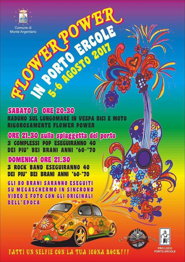 Fuori dagli armadi e dalle cantine pantaloni a zampa, giacche di lamè e vestiti a fiori e tutto l’abbigliamento che ricorda gli anni ’60 e ’70. Torna, sabato 5 e domenica 6 agosto 2017, Flower Power, evento amarcord che la Pro Loco Porto Ercole ed il comitato della Notte dei Pirati organizzano da alcune stagioni con il patrocinio del Comune di Monte Argentario.
