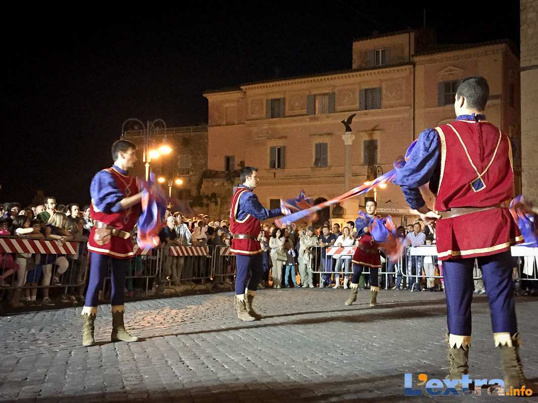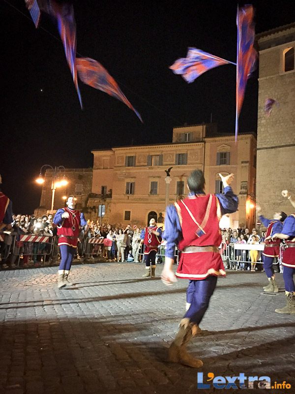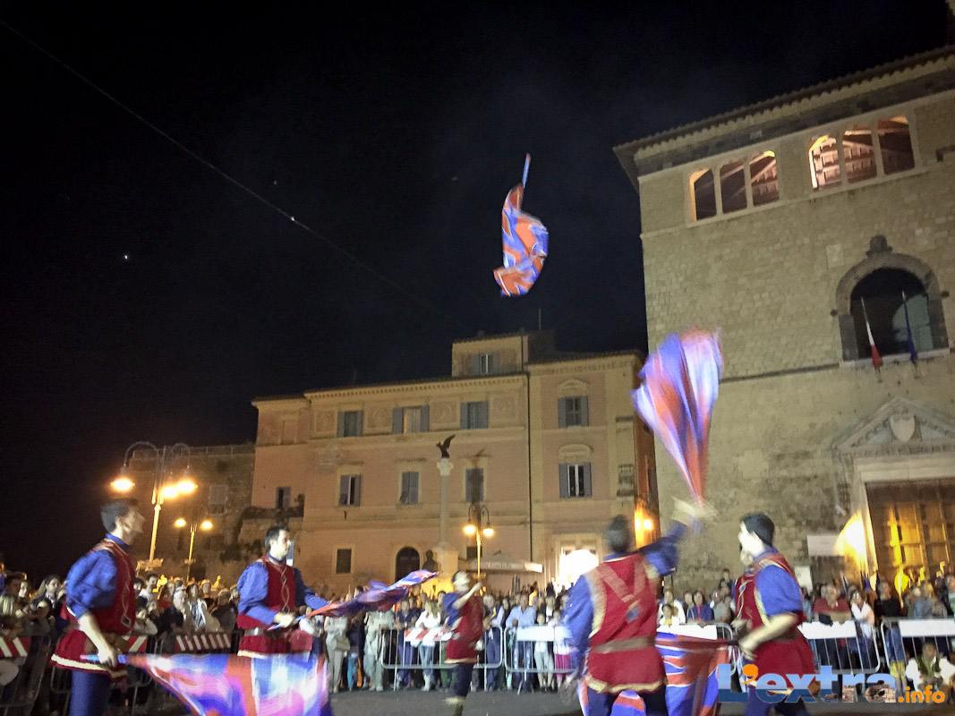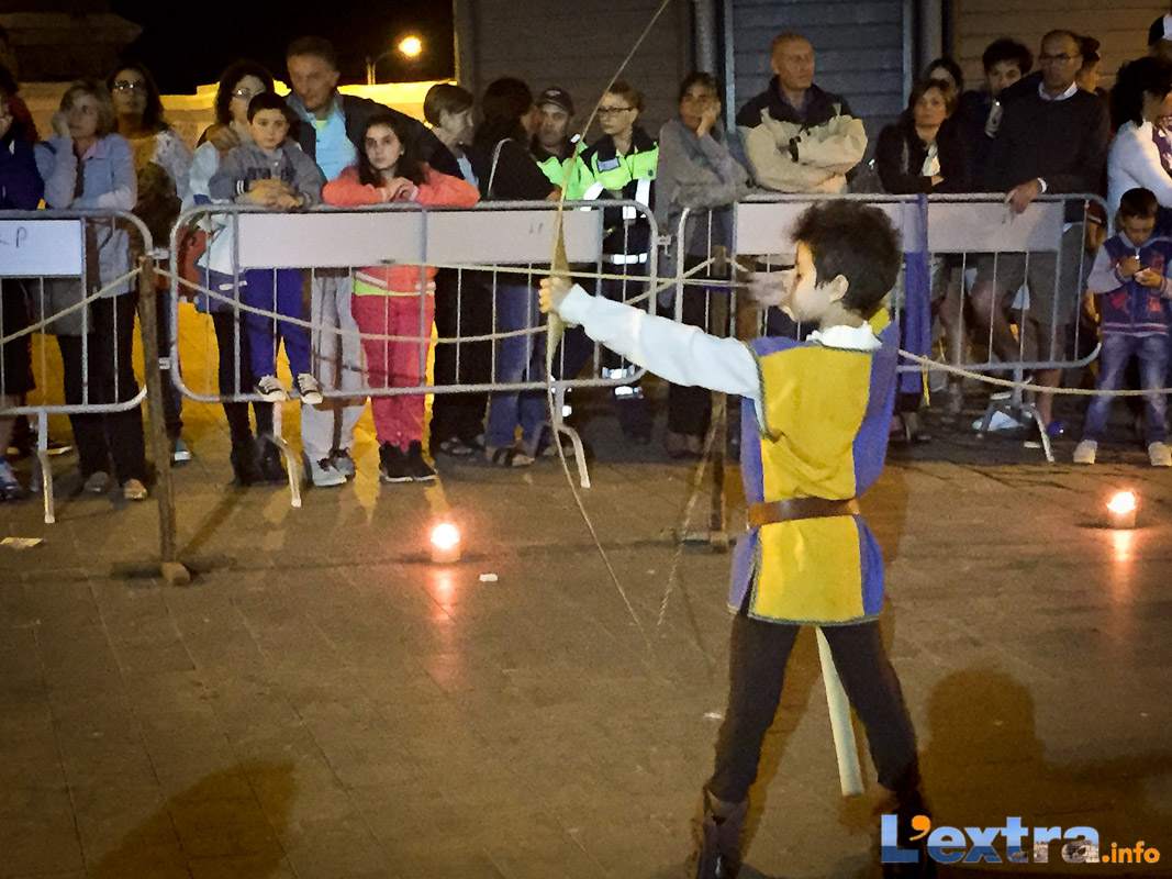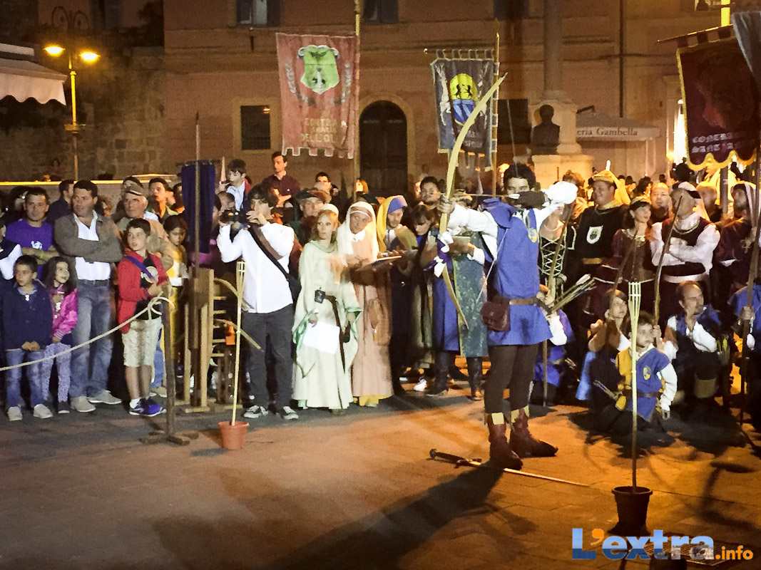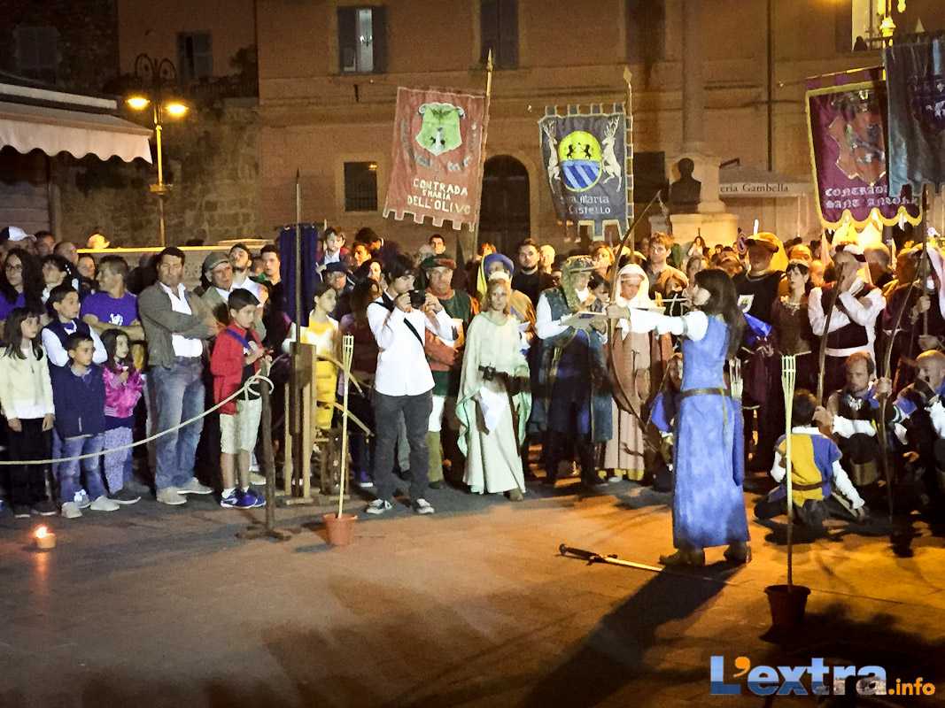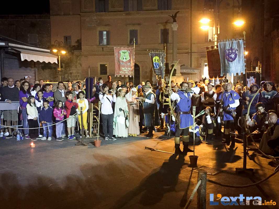 Bello e suggestivo anche il contest degli sbandieratori. Le Contrade del Palio di Allumiere ospiti nella piazza hanno dato spettacolo. Esibizione che ha visto prevalere la contrada della Nona, per insindacabile voto delle dame presenti. Volontà degli organizzatori è infatti quella di collaborare con giostre, palii e manifestazioni che hanno spirito comune. In quest’ottica gradita presenza anche quella del gruppo Arcieri Viterbiensis. Le frecce scoccate da madonne e messeri hanno determinato l’ordine di partenza del palio. Onore del Campo alla contrada di San Franceso, il sodalizio che ritorna in questo 2015.