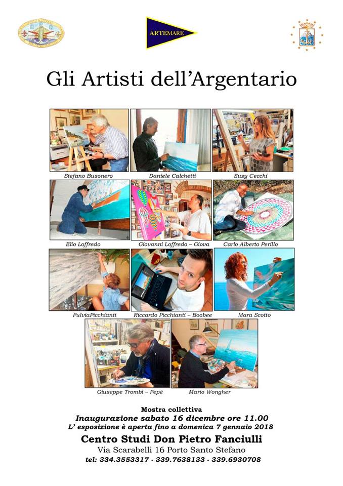 Undici tra i più apprezzati artisti dell’Argentario espongono le loro opere durante questo periodo natalizio nei locali del Centro Studi Don Pietro Fanciulli a Porto Santo Stefano. La mostra collettiva “Gli artisti dell’Argentario”, organizzata dello stesso Centro con la galleria Artemare ed il patrocinio de Comune di Monte Argentario, è stata inaugurata sabato 16 dicembre scorso e resterà aperta fino a domenica 7 gennaio 2018 (orario tutti i giorni dalle ore 10 alle 12 ed il mercoledì e venerdi anche dalle 16 alle 18).
