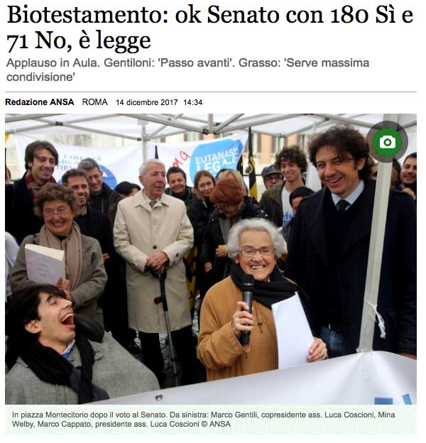 “Finalmente, se la legge sul Biotestamento sarà approvata così come sembra, le mie volontà sul fine vita avranno un valore certo ed inequivocabile”, dichiarava appena ieri, e ora con sollievo può togliere il periodo ipotetico. “Ho già predisposto le Dat – spiegava ieri Marco all’ANSA – nel Comune di Tarquinia, con il registro promulgato unanimemente il 19 marzo 2015 e attivato a dicembre dello stesso anno. Credo di essere stato uno dei primi a redigere le Dat nel mio Comune visto che, oltretutto, proposi tale possibilità durante il periodo amministrativo”.