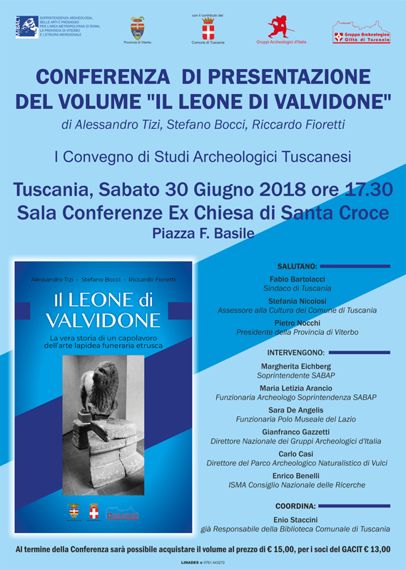 Il Gruppo Archeologico Città di Tuscania organizza, con il contributo del Comune di Tuscania e in collaborazione con la Provincia di Viterbo e i Gruppi Archeologici d’Italia, la Conferenza di presentazione del volume “Il Leone di Valvidone” nell’ambito del I Convegno di Studi Archeologici Tuscanesi. La conferenza si terrà sabato 30 giugno 2018 alle ore 17.30 nella stupenda cornice della sala conferenze comunale dell’ex Chiesa di Santa Croce in Piazza F. Basile a Tuscania.