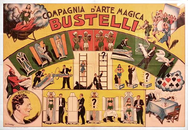 Gli spettacoli del Mago Bustelli, durante i quali tutto poteva accadere, anche l’impossibile, erano impressionanti, ma molto divertenti perché, come scrivevano i giornali dell’epoca, prevedevano “fantasmagorie arabe e giapponesi, illusioni ottiche, scene comiche esilaranti e balletti degni di uno show di Broadway”: fascinosi spettacoli con luci soffuse che scivolavano su drappeggi di seta e di raso odorosi di Coty, con ballerine piroettanti a mezz’aria sulla punta di una spada, ragazze coperte di lustrini che sparivano tra i veli rossi di improbabili pagode cinesi, donne che si lasciavano tagliare in tre pezzi con il sorriso sulle labbra, bambini avvolti nelle fiamme e, in casi eccezionali, autentici neonati perduti e successivamente ritrovati sotto il cappello di uno spettatore dell’ultima fila. Poi, cavalli bianchi con relativi cavalieri vestiti da Buffalo Bill e armati di carabina Remington, che evaporavano nell’aria in una nuvoletta di fumo colorato e terrorizzanti mostri alti dodici metri che scendevano pesantemente in platea, per poi disintegrarsi come lievi bolle di sapone, in forma di coriandoli d’oro e d’argento. Inoltre, Bustelli fu l’unico uomo al mondo capace di eseguire impeccabilmente il più difficile esercizio del Mago Houdini, il famoso numero universalmente noto con il titolo Il decapitato recalcitrante.