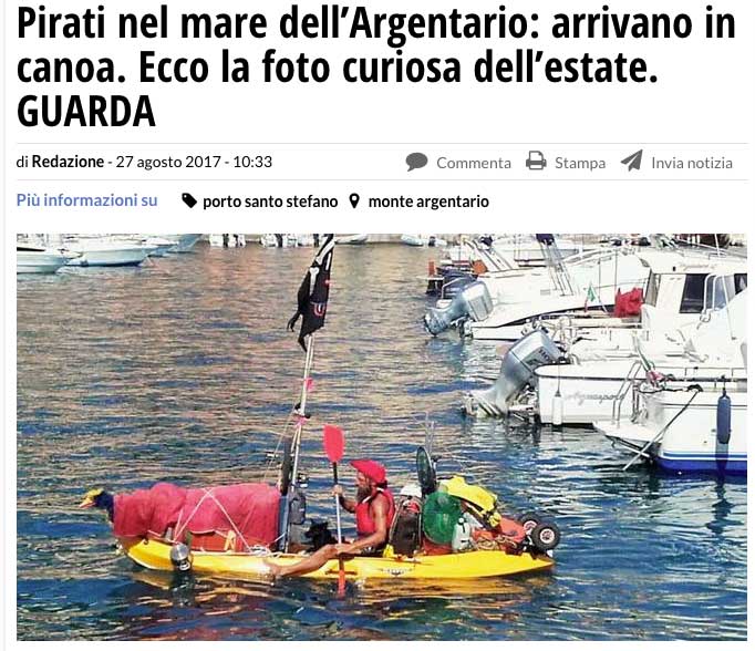 La curiosità suscitata all’argentario, infatti, lo ha portato ad apparire anche sulle cronache di qualche testata locale, che lo ha fotografato intento nello spostarsi verso Talamone, “scomodando”, nel suo racconto, paragoni importanti: prima quello con i pirati che in passato assalirono – con fare evidentemente meno pacifico e giocoso – il promontorio, quindi con Robinson Crusoe.