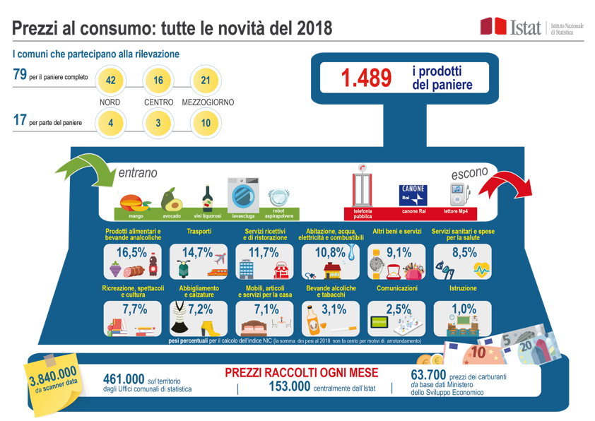 Nel 2018 entrano nel paniere cinque nuovi prodotti: l’Avocado, il Mango, i Vini liquorosi, la Lavasciuga e il Robot aspirapolvere. Escono dal paniere la Telefonia pubblica, il Canone Rai e il Lettore Mp4.
