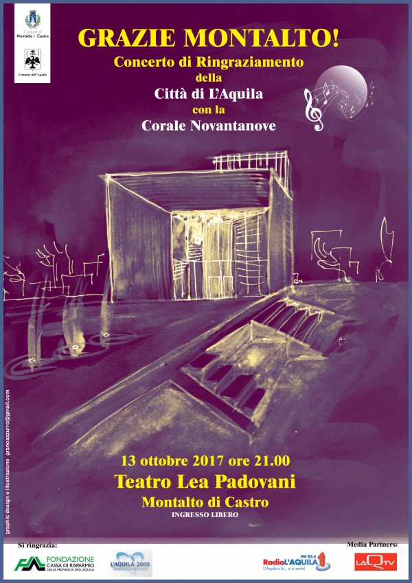 Venerdì 13 ottobre, alle ore 21, presso il teatro comunale Lea Padovani, si terrà il concerto di ringraziamento della Corale Novantanove della città di L’Aquila per la cittadinanza di Montalto di Castro. L’evento è maturato a seguito della generosa donazione del Comune di Montalto di Castro a favore degli allievi del conservatorio “Alfredo Casella”, vittime del tragico terremoto di Amatrice, attraverso la visita del sindaco Sergio Caci alla 723esima Perdonanza Celestiniana con l’acquisizione della Croce del Perdono 2016 e il suo affidamento, quale perenne custode, al Comune di L’Aquila. Il concerto della Corale Novantanove, storica eccellenza musicale e artistica aquilana, è l’occasione per una ulteriore fraterna vicinanza tra due comunità, che si incontreranno il 13 ottobre al teatro Lea Padovani (ingresso libero).