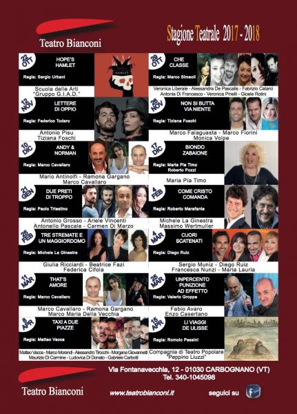 La Direzione Artistica del Teatro Bianconi di Carbognano ha pubblicato il cartellone della nuova stagione teatrale. Uno stuzzicante mix di grandi classici, veri e propri cult, abbinati ad una serie di nuove produzioni che vedono protagonisti i migliori attori del momento della Commedia Italiana. Un condensato unico di suggestioni e divertimento, 14 spettacoli comici, intensi, entusiasmanti, emozionanti: tutta la magia del Teatro in un’unica stagione che inizierà il 22 ottobre prossimo con lo spettacolo dell’Accademia delle Arti del Gruppo Giad Hope’s Hamlet nel corso del quale verrà ufficialmente presentata al pubblico e alla stampa il nuovo cartellone.