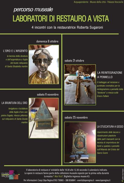 Nei prossimi tre appuntamenti le restauratrici ci parleranno della reintegrazione a pennello, della bronitura dell’oro ed infine della stuccatura a gesso. Saranno tre iniziative uniche nel suo genere, in cui non solo verrà raccontata la storia dei reperti, ma soprattutto verrà svelato il “dietro le quinte” che si cela nel ripristino di queste opere, rivelando con grande semplicità, fra le tante curiosità, tutti i trucchi dell’antico mestiere del restauratore.