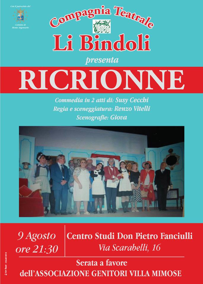 Divertimento e solidarietà, come d’altronde accade ad ogni loro esibizione, con la compagnia teatrale santostefanese de Li Bindoli che mercoledì 9 agosto 2017 alle ore 21.30 propone al Centro Studi Don Pietro Fanciulli di via Scarabelli a Porto Santo Stefano uno dei suoi ultimi cavalli di battaglia. Ricrionne è il titolo della commedia in due atti di Susy Cecchi, per la regia e la sceneggiatura di Renzo Vitelli e la scenografia di Giova