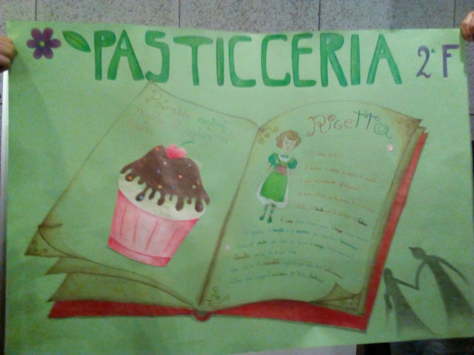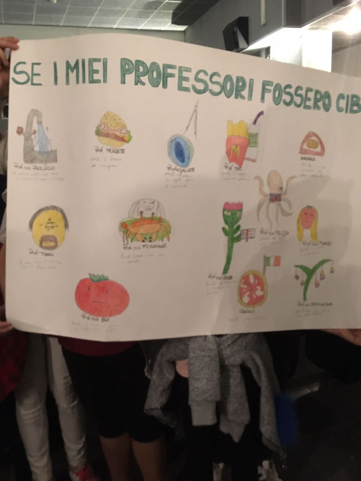 E proprio dal cibo inizia la stimolante chiacchierata con i ragazzi: la sala gentilmente concessa dal direttore del Cinema Etrusco Gérôme Bourdezeau si riempie dell’entusiasmo della svampita pasticciera Euforbia, di cartelloni colorati con “descrizioni di alunni attraverso le ricette”, di “ritratti di professori in forma di cibi” e … di dolci, inaspettatamente preparati da alunni volenterosi: non addentiamoli però, perché sono di stoffa! E per chi non avesse ancora lo sprint giusto, la 2F offre la ricetta del pasticcino ‘potrebbe-venirmi-voglia-di-andare-a-scuola’!