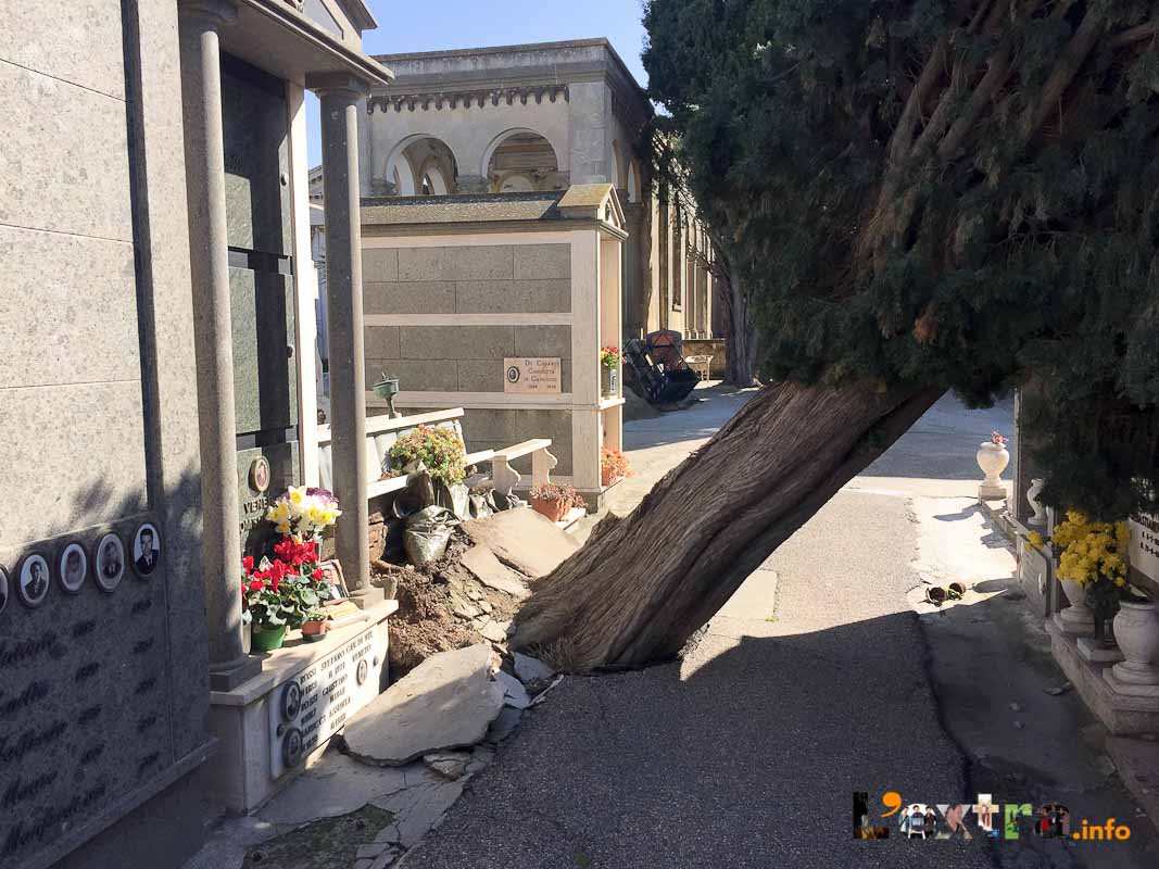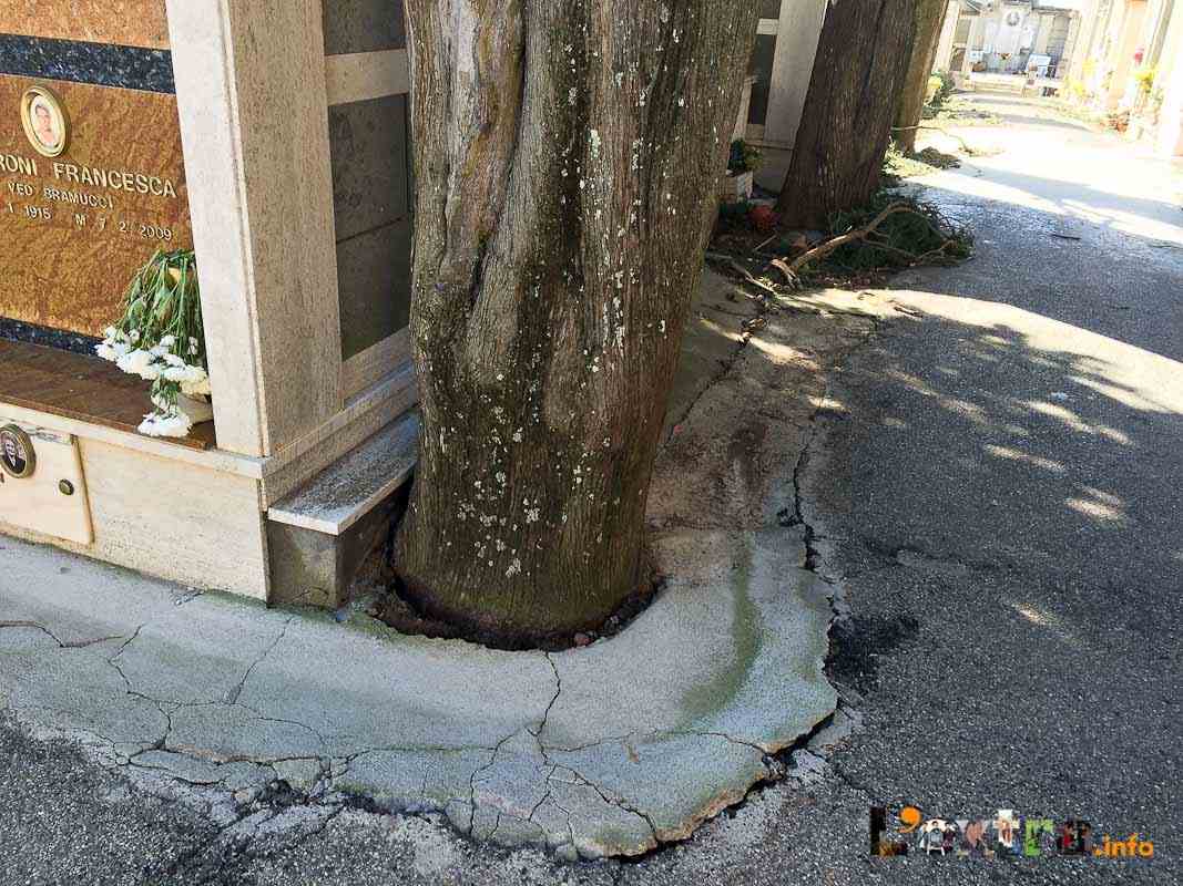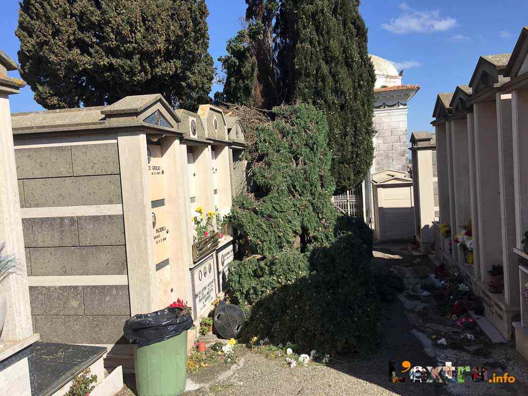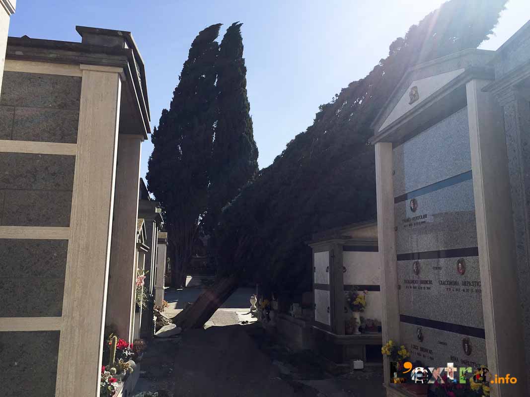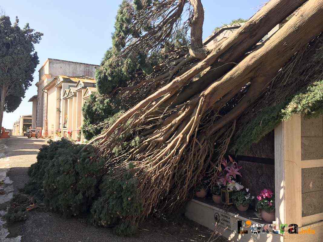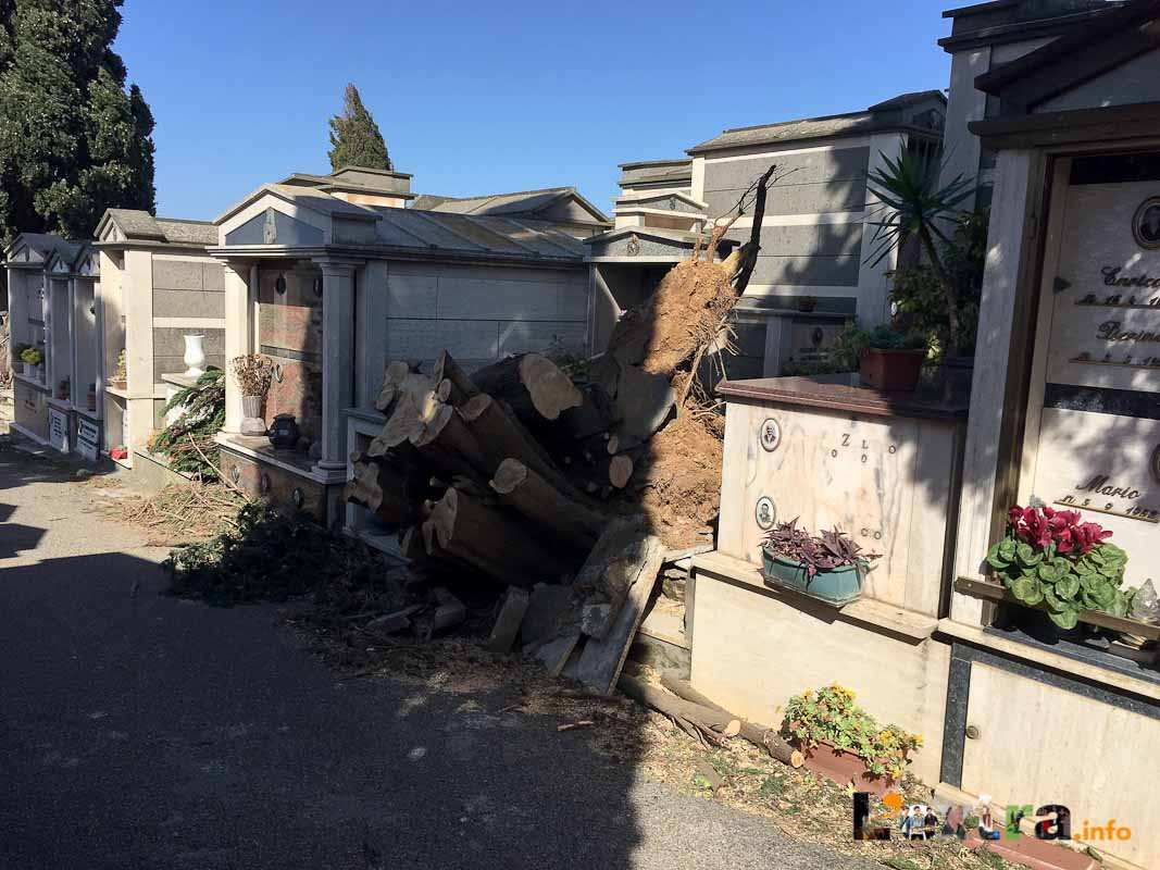 Pericolosa la situazione al cimitero – chiuso per caduta alberi – dove la conta dei danni e dei rischi è davvero impressionante. Tanti i cipressi abbattuti dalle raffiche, che continuano a battere con violenza su un’area notoriamente vittima del vento.