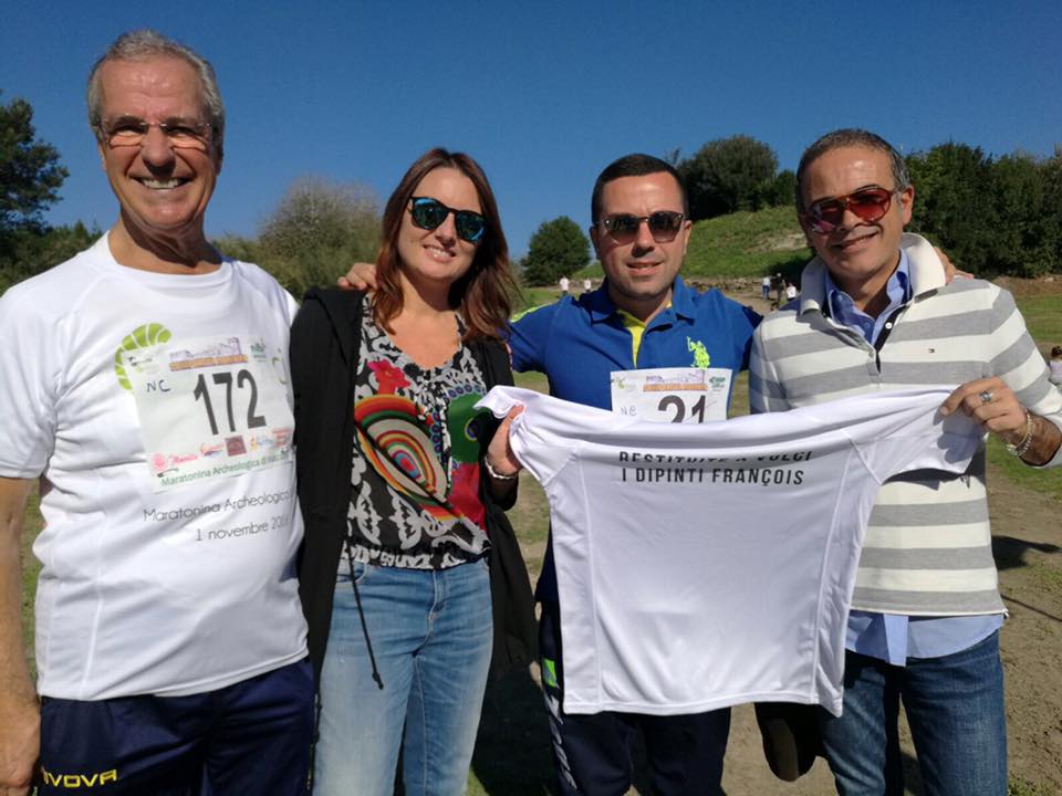 Un evento come sempre organizzato dalla Polisportiva Montalto, con il patrocinio del Comune, sotto l’egida dalla Uisp di Viterbo e sostenuto dalla Fondazione Vulci e dalla BCC Roma. Quest’anno la Maratonina archeologica di Vulci ha voluto lanciare un messaggio: “Restituite a Vulci i dipinti François”, la Campagna della Fondazione Vulci promossa dal presidente Carmelo Messina per rendere fruibili alla comunità i dipinti della tomba François oggi custoditi nell’abitazione privata della famiglia Torlonia. Ogni atleta ha infatti indossato la maglietta sulla quale era descritto lo slogan. Per l’amministrazione comunale, oltre al delegato allo sport Litardi, erano presenti gli assessori Corona e Mezzetti, oltre alla delegata al turismo Silvia Nardi.