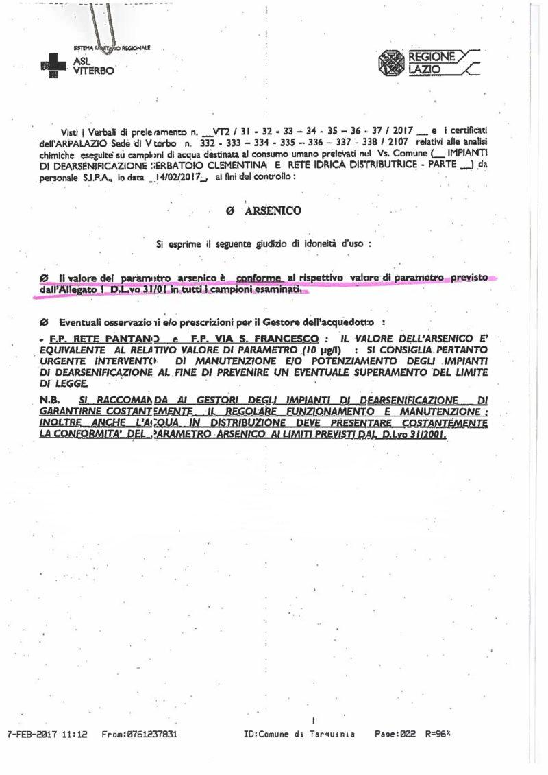 Il valore del parametro dell’arsenico è conforme al rispettivo valore di parametro previsto in tutti i campioni esaminati. Lo comunica in una nota al Comune di Tarquinia l’Asl di Viterbo. In sostanza, i valori rilevati dalle analisi condotte sui campioni di acqua prelevati lo scorso 14 febbraio, sono tutti entro i μg 10 per litro, il limite fissato dal decreto Legislativo 31/2001.