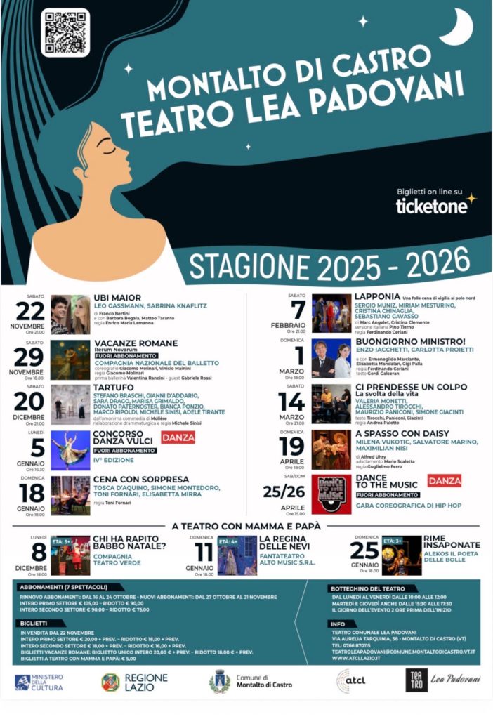 Il Comune di Montalto di Castro, in collaborazione con ATCL – Circuito Multidisciplinare del Lazio, e con il sostegno del Ministero della Cultura e della Regione Lazio, è lieto di presentare la nuova stagione teatrale 2025/2026 del Teatro Comunale Lea Padovani.