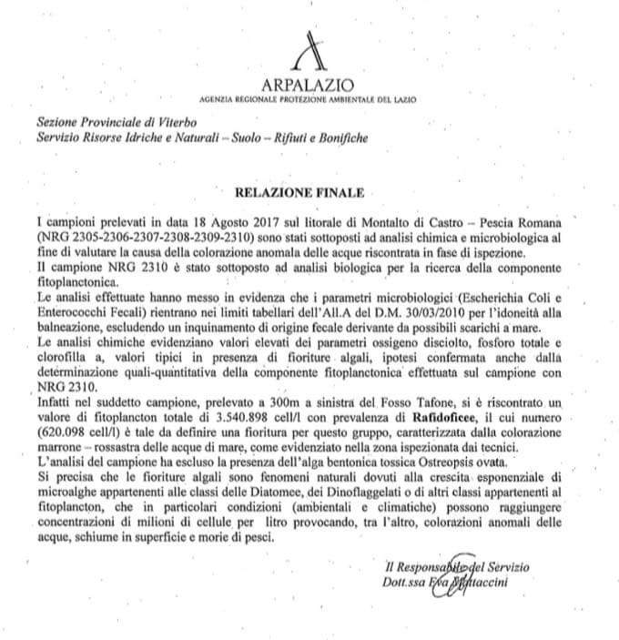 A seguito della nota del 19 agosto u.s., postata sulla pagina fb del comune di Montalto di Castro, con la quale già si scongiurava la presenza di elementi inquinanti in mare, pubblichiamo la relazione finale dell’Arpa Lazio (Agenzia Regionale Protezione Ambientale). Le analisi hanno messo in evidenza che i parametri microbiologici rientrano nei limiti tabellari per l’idoneità alla balneazione, escludendo un inquinamento derivante da possibili scarichi a mare.