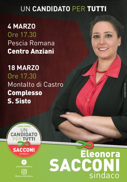 Il Comitato per la Lista Civica “Eleonora Sacconi Sindaco” presenterà sabato 4 marzo alle ore 17,30 al Centro Anziani di Pescia Romana e sabato 18 marzo alle 17,30 a Montalto di Castro nel Complesso Monumentale di San Sisto, il proprio candidato alla carica di Sindaco.