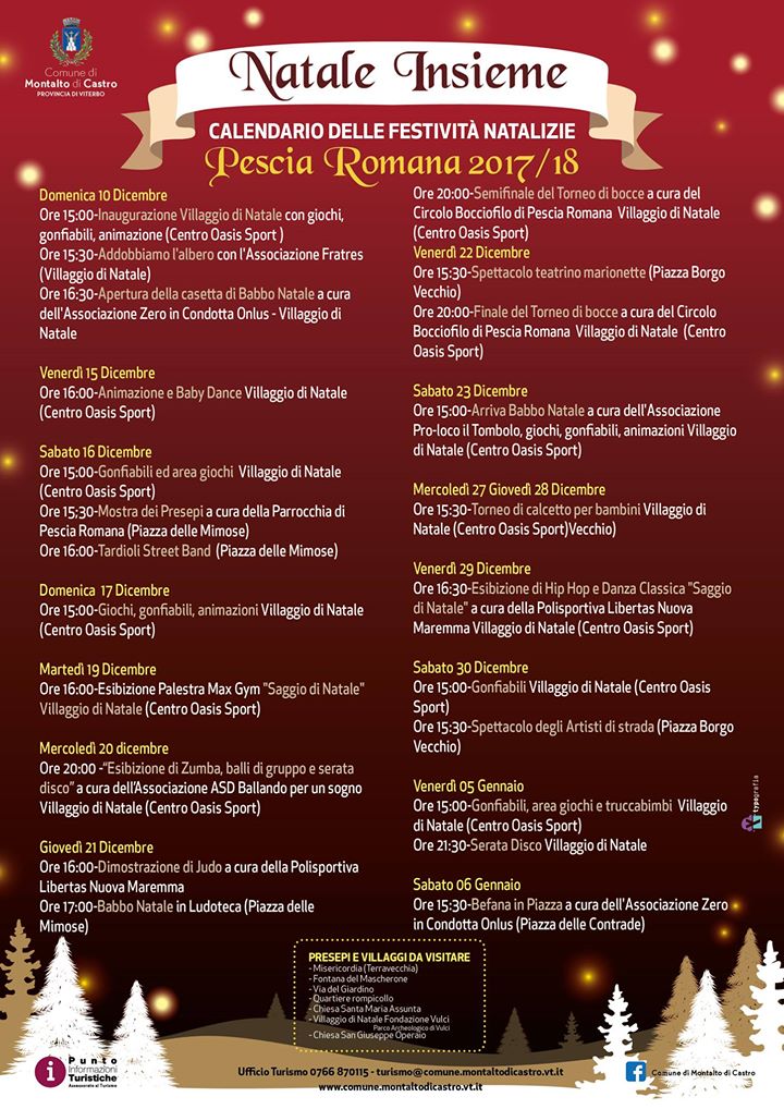 «Anche quest’anno – commenta il sindaco Sergio Caci – sarà un ricco Natale tra Montalto, Pescia e il parco di Vulci. Ringrazio i cittadini, le cooperative e le associazioni culturali e sportive che hanno collaborato con l’amministrazione comunale alla realizzazione del cartellone». Durante il periodo natalizio saranno inoltre aperti i punti di informazioni turistica: Montalto di Castro, Via Tirrenia n.1 tel. 0766.87.98.2; Pescia Romana, Largo Consalvo Adorno (Borgo Nuovo) tel. 0766.830.932