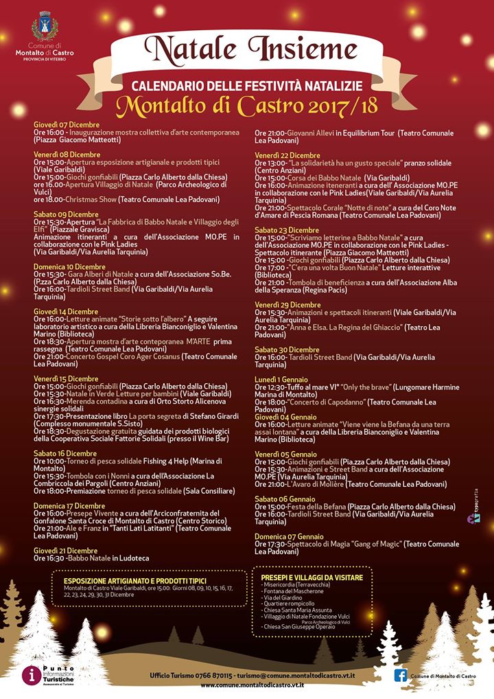 Si inizia giovedì 7 dicembre con l’inaugurazione della “mostra collettiva d’arte contemporanea” (piazza G. Matteotti) alle ore 16:00; da venerdì 8 dicembre, per tutti i fine settimana (fino al 31 dicembre) a viale Garibaldi nel capoluogo saranno aperti i “mercatini di natale”, tra oggettistica e prodotti tipici, mentre al parco di Vulci sarà visitabile, tutti i giorni, il “Villaggio di Natale” della Fondazione Vulci.