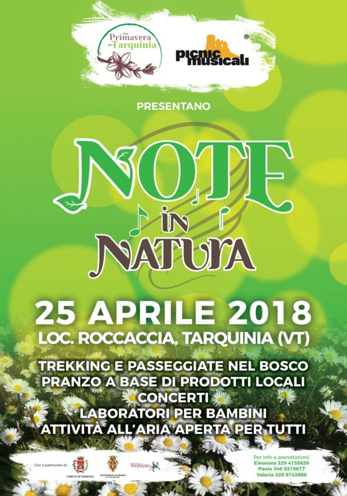 “Note in Natura” è la prima tappa di un evento itinerante ideato dall’Associazione Una primavera per Tarquinia – APS in collaborazione con i Picnic Musicali – Tolfa Jazz ; ha lo scopo di valorizzare il territorio tarquiniese dal punto di vista storico, naturalistico e culturale.