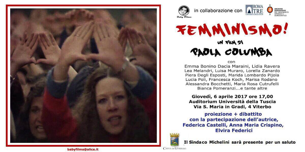 Domani, giovedì 6 aprile alle ore 17, all’Auditorium dell’Università della Tuscia, in via Santa Maria in Gradi 4, ci sarà la proiezione di Femminismo! di Paola Columba, il film documentario di 52 minuti che ha ricevuto la Menzione Speciale ai Nastri d’Argento 2017.