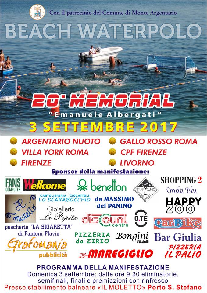 E’ giunto alla 20° edizione il Memorial “Emanuele Albergati”, organizzato come ogni anno dall’asd Argentario Nuoto, beach waterpolo con il patrocinio del Comune di Monte Argentario ed il sostegno di numerose attività commerciali di Porto Santo Stefano. Segno evidente che gli atleti degli sport acquatici e l’intera comunità non dimentica questo giovane scomparso prematuramente e dedica a lui ed ai suoi familiari l’ultimo torneo della stagione estiva in mare.