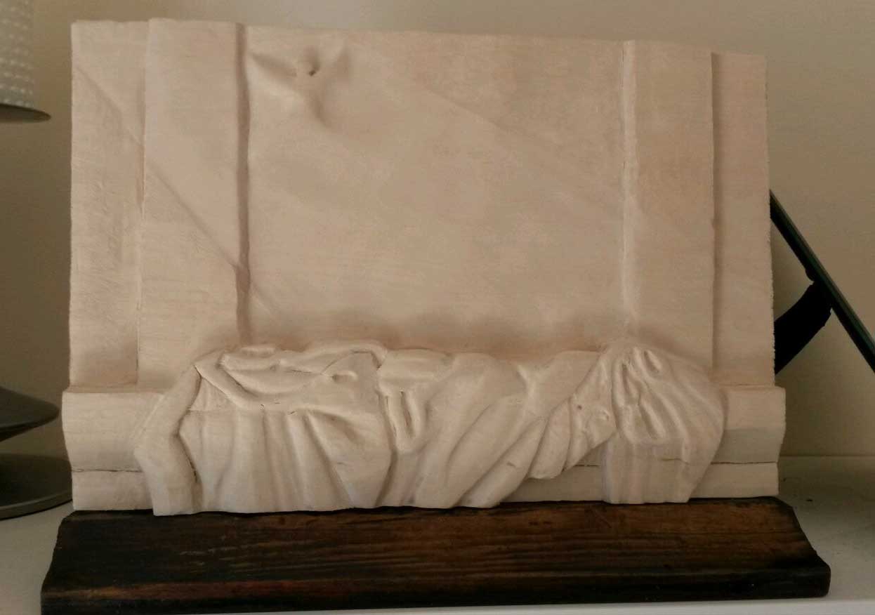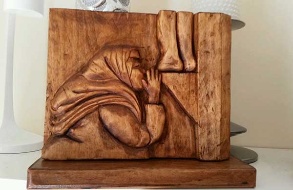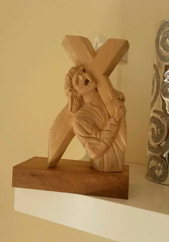 Le tre realizzazioni sono un Cristo, dal titolo “La Passione”, in legno di tiglio su base riciclata di iroko, una “Maria” in legno di tiglio impregnato noce chiaro su base riciclata teak ed infine “La Resurrezione” in legno di tiglio su base riciclata di legno impregnato noce scuro, tutti intagliati con tecnica punta di coltello