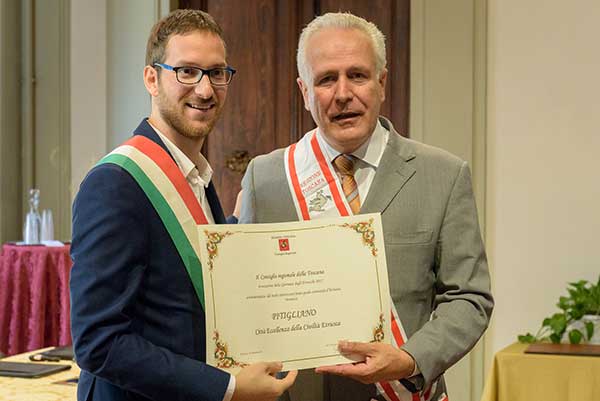 Il prestigioso riconoscimento è stato consegnato a Firenze, nella sala del Gonfalone, direttamente al sindaco di Pitigliano, Giovanni Gentili, dal presidente del Consiglio regionale della Toscana Eugenio Giani, in occasione della Giornata degli Etruschi, nel corso della cerimonia di apertura della mostra “Acque sacre, culto etrusco sull’Appennino toscano”.