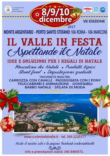 Atmosfera natalizia in grande stile, per il ponte dell’Immacolata, nel quartiere del Valle di Porto Santo Stefano. Venerdì 8, sabato 9 e domenica 10 dicembre 2017 il Ccn Le Vie del Valle e l’Ente Palio Marinaro dell’Argentario con il patrocinio del Comune di Monte Argentario organizzano la settima edizione de Il Valle in Festa – Aspettando il Natale.