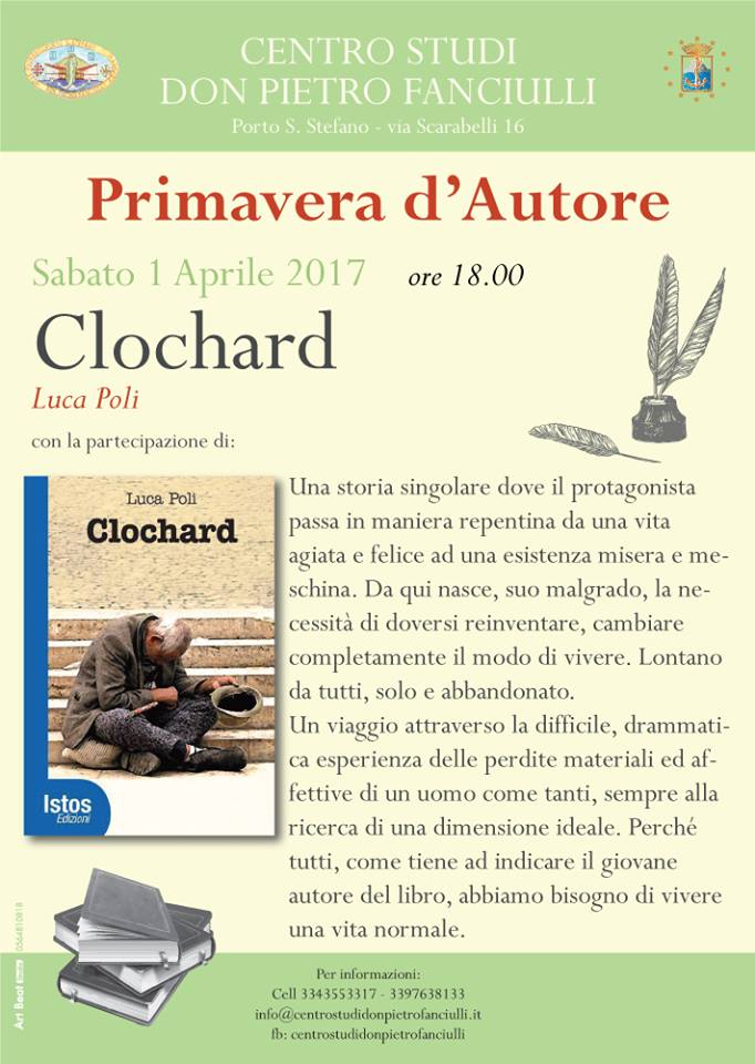 Secondo appuntamento, sabato primo aprile 2017, con la rassegna letteraria Primavera d’Autore, organizzata dal Centro Studi Don Pietro Fanciulli di Porto Santo Stefano con il patrocinio del Comune di Monte Argentario. La sede del Centro, in via Scarabelli, ospiterà alle ore 18.00 come sempre ad ingresso gratuito, la presentazione del libro Clochard di Luca Poli. Parteciperà all’incontro Matteo Guerra.