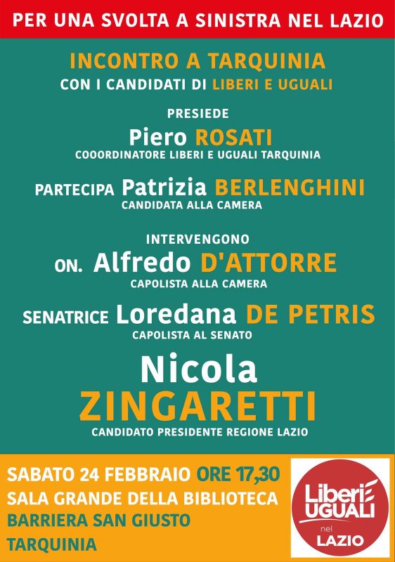 Presiederà l’incontro Piero Rosati, coordinatore di Liberi e Uguali a Tarquinia, e parteciperanno il candidato Presidente alla Regione Lazio Nicola Zingaretti, Patrizio Berlenghini, candidata alla Camera, Alfredo D’Attorre e capolista alla Camera, Loredana De Petris, capolista al Senato.