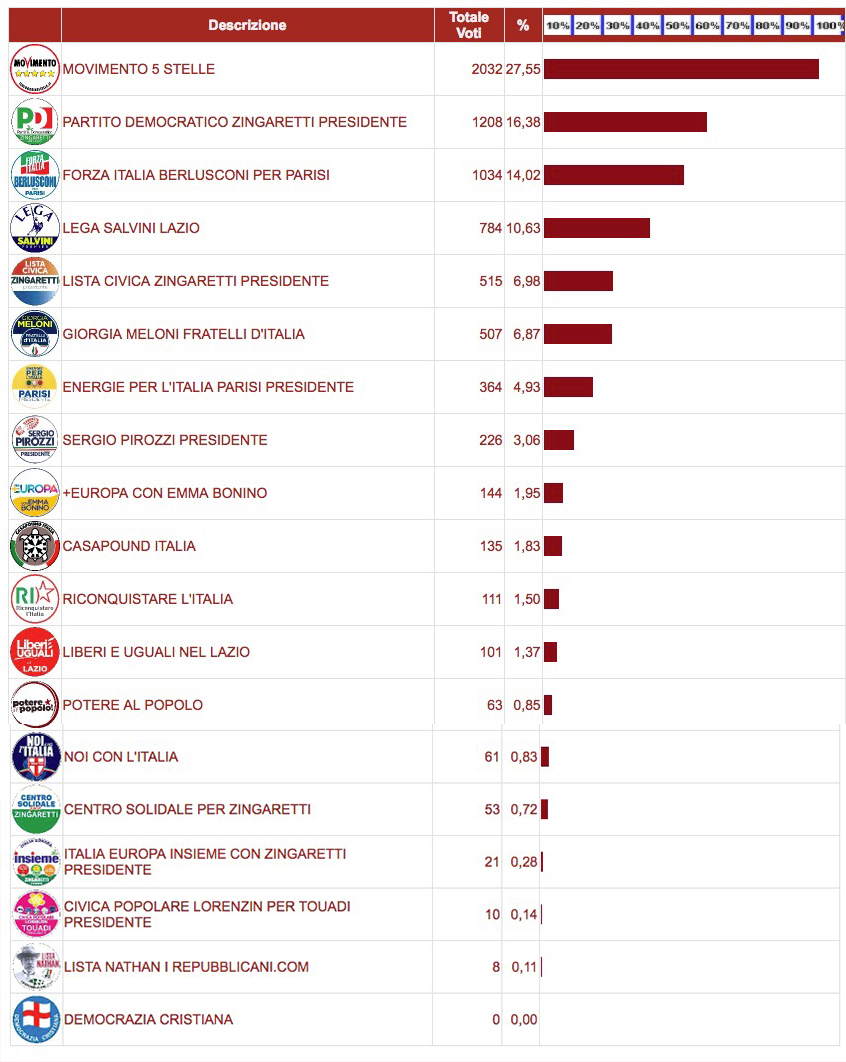 #Regionali2018 – Tarquinia: i risultati per lista: M5S al 27,55%, PD 16, 38%, Forza Italia 14% Pubblicato il 5 Marzo 2018, 22:30
