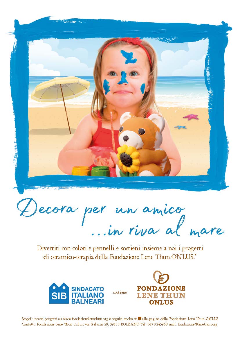 Con questa iniziativa, denominata “Decora per un amico in riva al mare”, interamente finanziata dal S.I.B., il Sindacato degli imprenditori balneari vuole contribuire in maniera concreta alla Fondazione Contessa Lene Thun Onlus, (prima onlus di terapia ricreativa per capillarità e diffusione sul territorio nazionale), impegnata nella realizzazione di laboratori gratuiti di terapia ricreativa attraverso la modellazione dell’argilla (ceramico-terapia) in contesti di malattia e disagio, in particolare dell’età pediatrica.