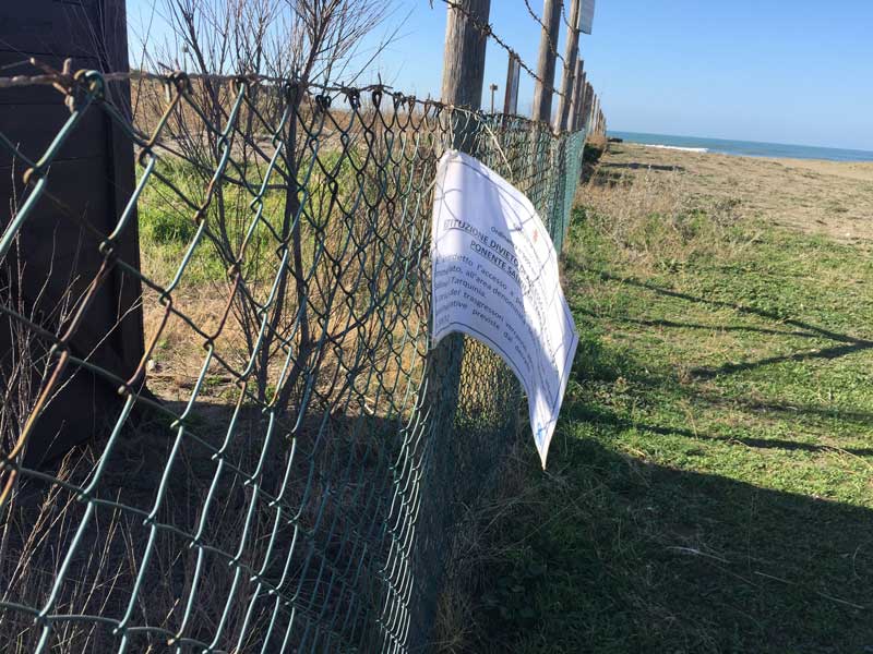 Una soluzione? No di certo. Per almeno due motivi. Il primo è evidente a seguito del sopralluogo effettuato ieri mattina, documentato dalle foto nella galleria a fondo articolo. I due cartelli che abbiamo potuto trovare sono, infatti, scarsamente visibili, non riportano in maniera evidente segnali di divieto e richiami per l’attenzione ed uno è perfino quasi del tutto staccato e non leggibile. Non solo: a quanto abbiamo potuto verificare, quei cartelli sono (poco) visibili solo se si giunge dalla strada che porta all’interno dell’oasi (per intenderci, dalla sbarra poco oltre il ponticello delle Saline): per cui nessuna indicazione dell’ordinanza è data a chi giunge via spiaggia dal Porticciolo – non sono pochi i camminatori durante la giornata – men che meno per chi giunge da San Giorgio, lato su cui non è presente nemmeno la palizzata, come se il pericolo per l’incolumità fosse solo per chi sale da nord.