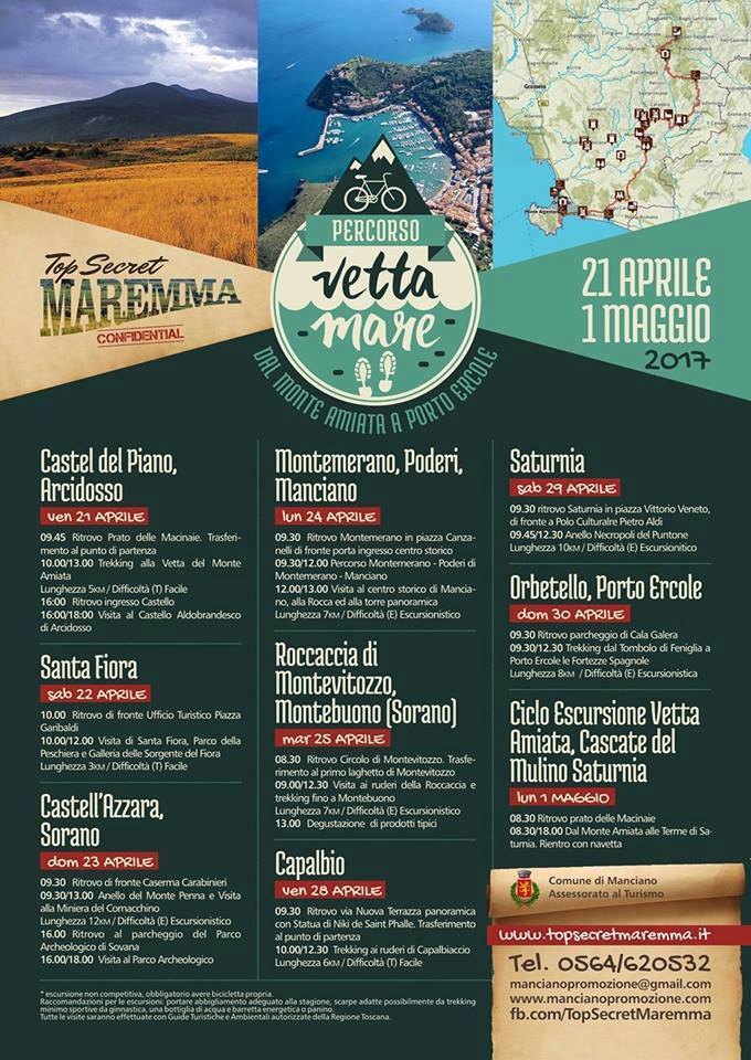 Il progetto Vetta – Mare, strutturato dal Comune di Manciano, ente capofila e sostenuto dai Comuni di Arcidosso, Castel del Piano, Santa Fiora, Castell’Azzara, Sorano, Capalbio, Monte Argentario e Orbetello, si pone l’obiettivo di promuovere un percorso di 136 chilometri di sentieri, ippovie e ciclovie, dalla montagna al mare, per gli appassionati di escursionismo e cicloturismo. Info e prenotazione delle escursioni di venerdì 21 e sabato 22 aprile: 329 1356875