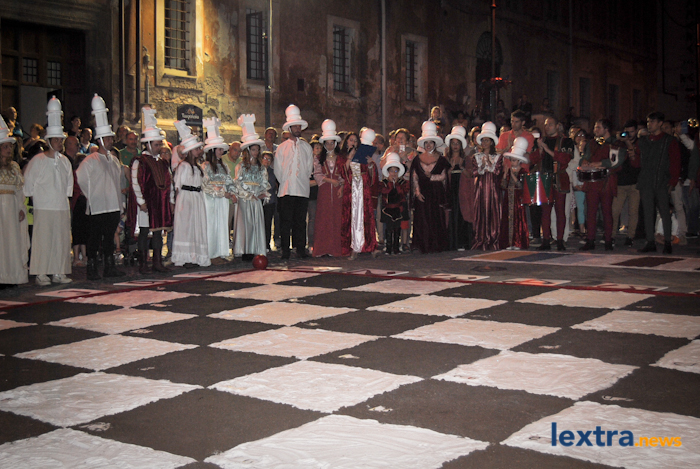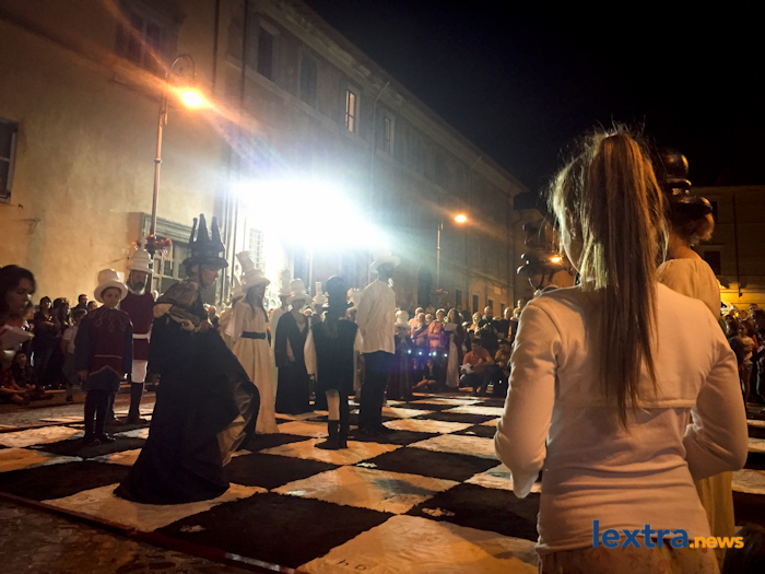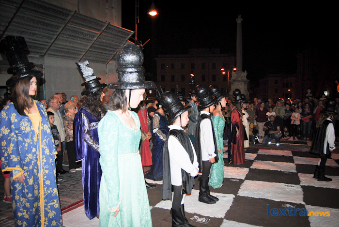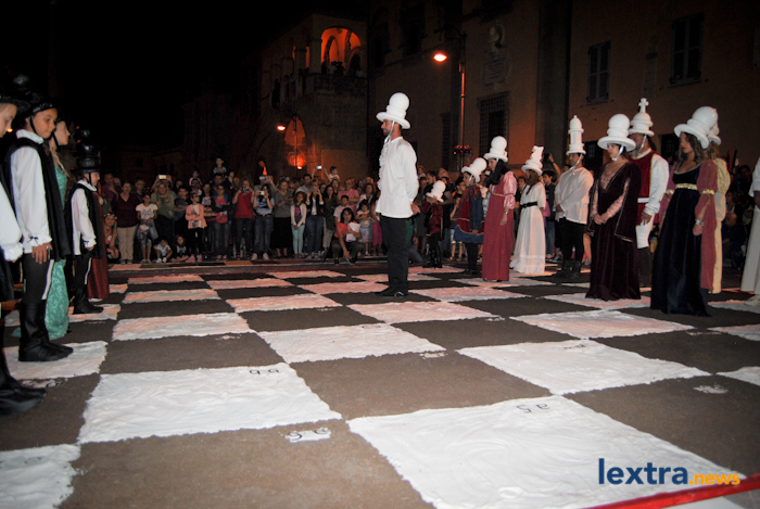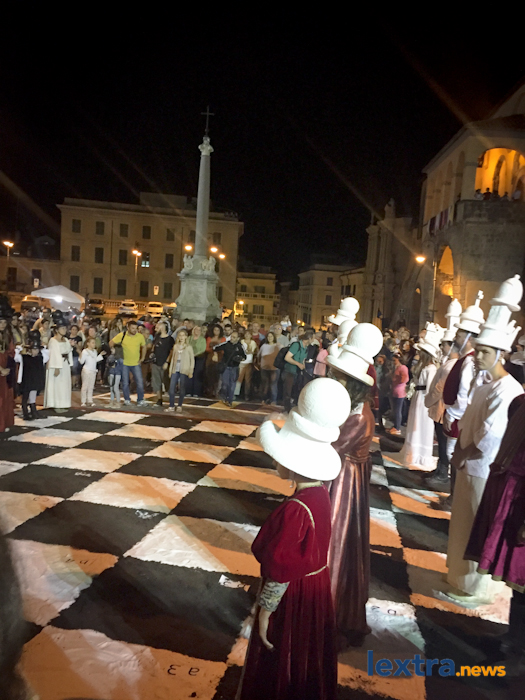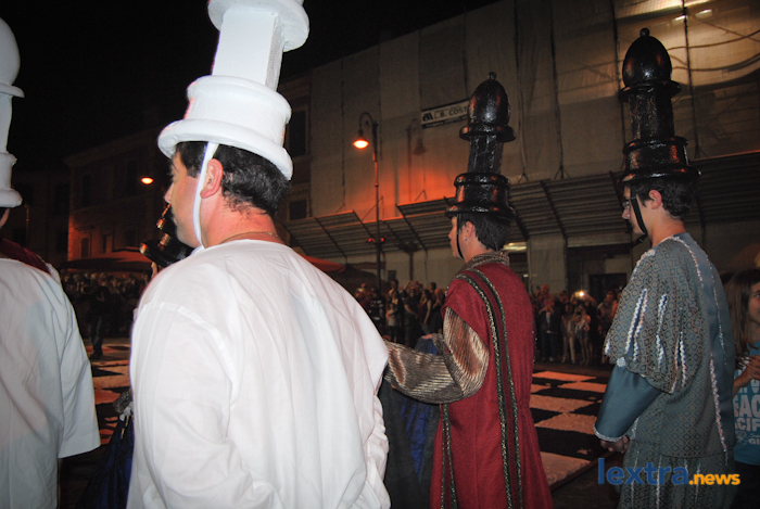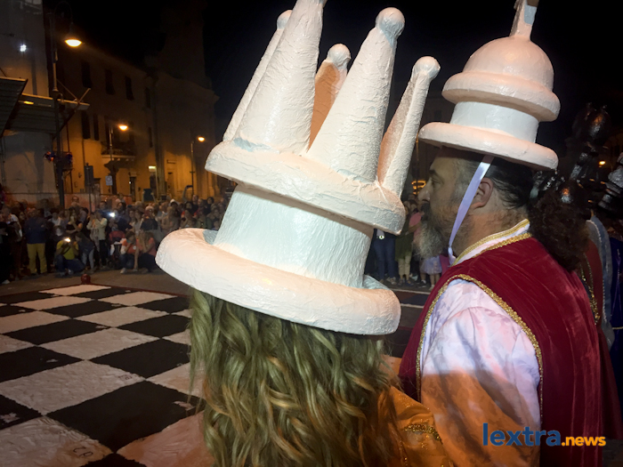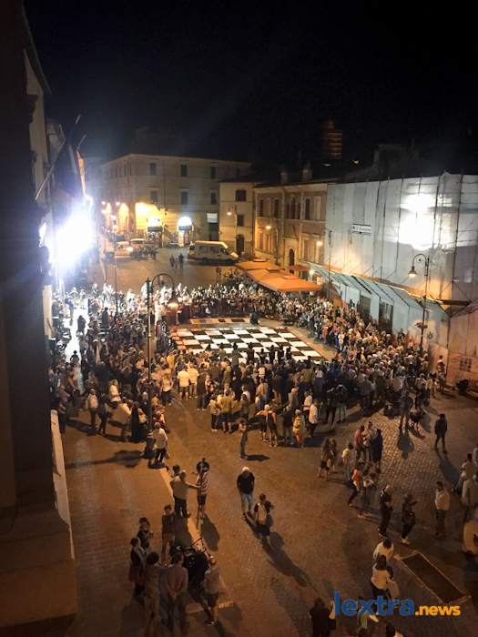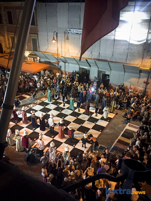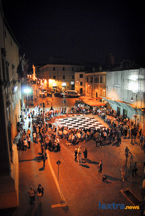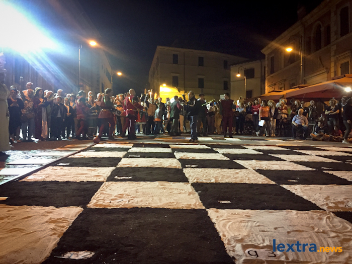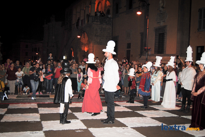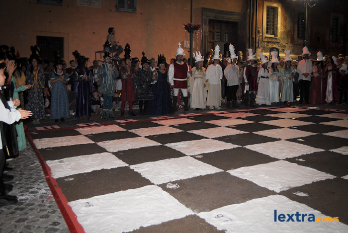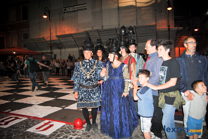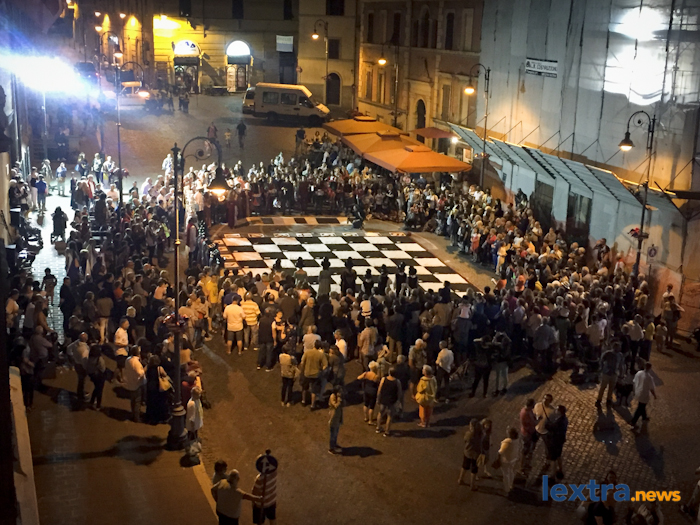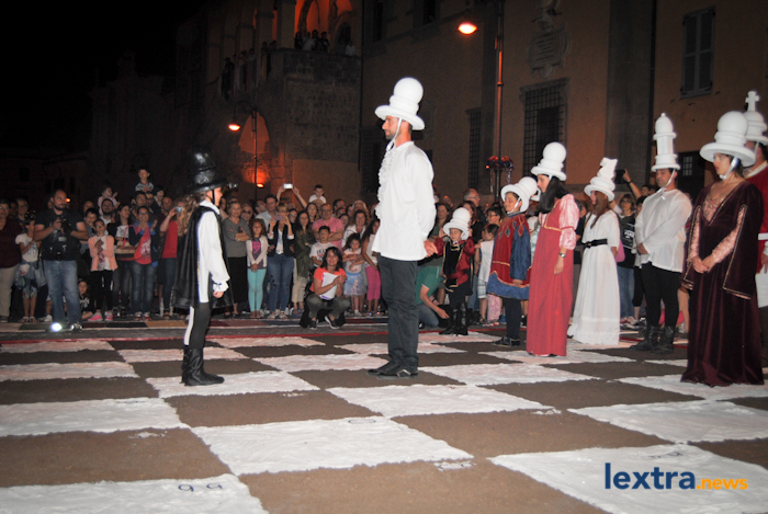 Il weekend tarquiniese della Giostra delle Contrade prosegue, in questo sabato sera, con l’inedita scacchiera vivente: mentre cresce l’attesa per il Palio di domani, si sono sfidati bianchi e neri sulla scacchiera di piazza Matteotti tra la curiosità dei presenti.