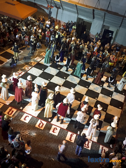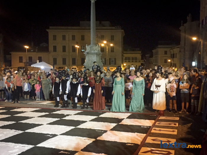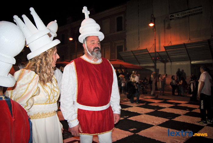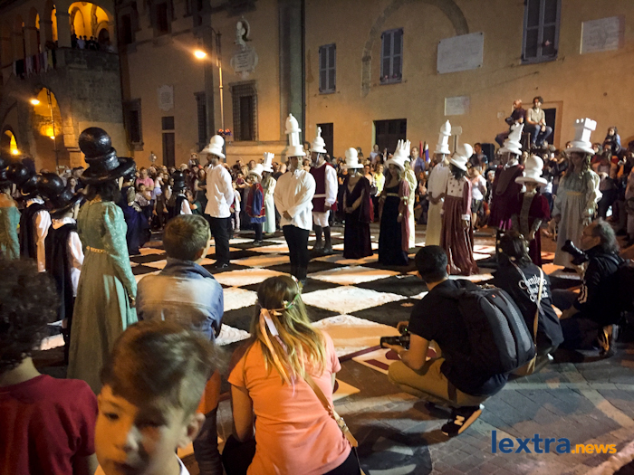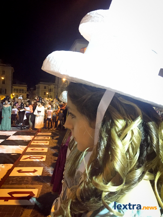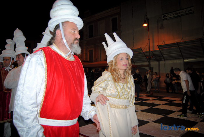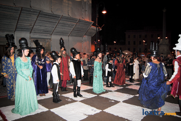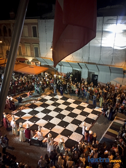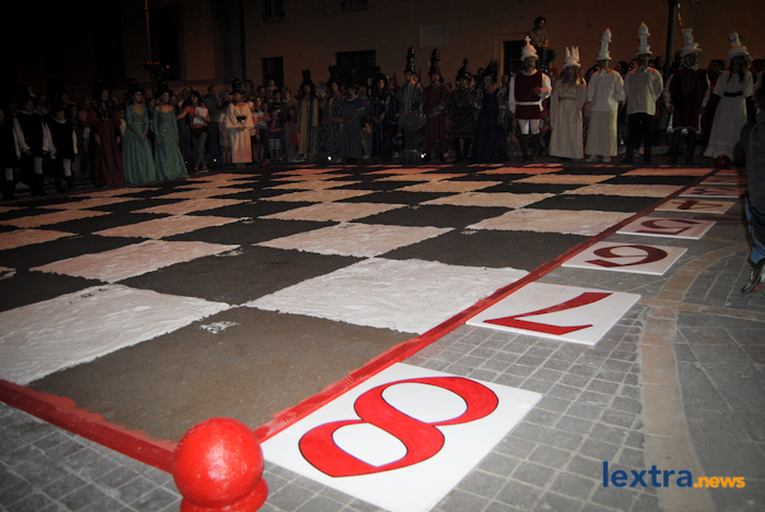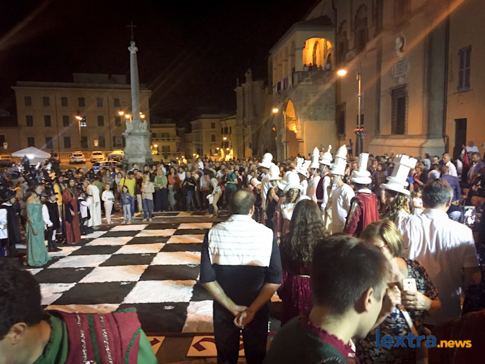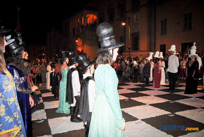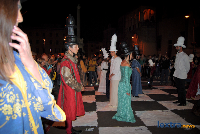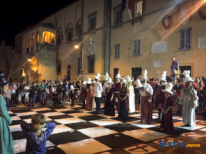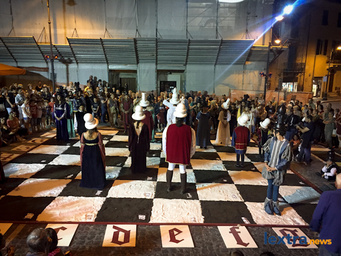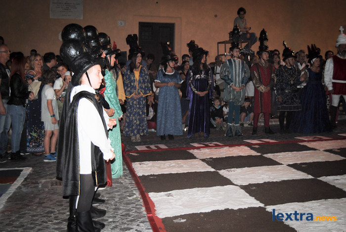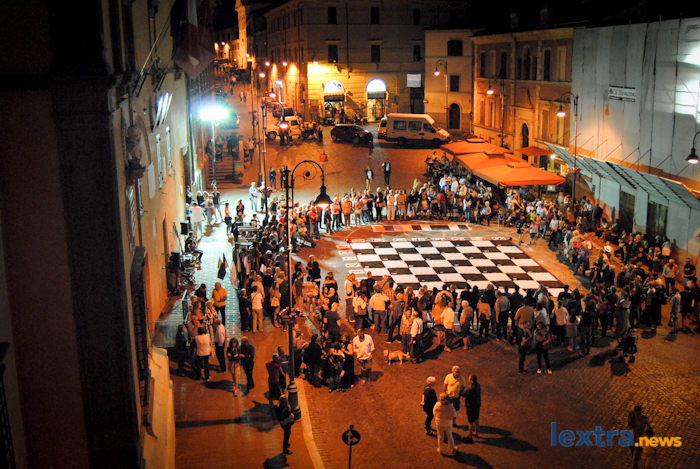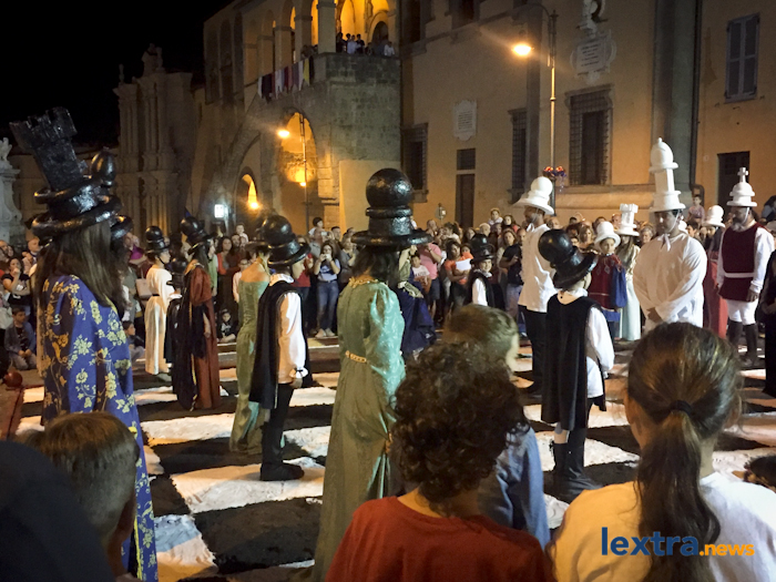 Il weekend tarquiniese della Giostra delle Contrade prosegue, in questo sabato sera, con l’inedita scacchiera vivente: mentre cresce l’attesa per il Palio di domani, si sono sfidati bianchi e neri sulla scacchiera di piazza Matteotti tra la curiosità dei presenti.