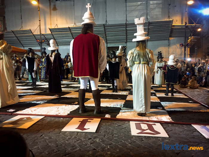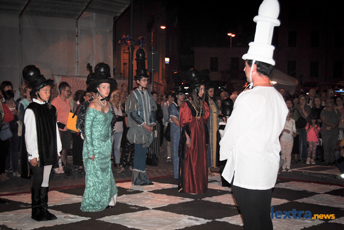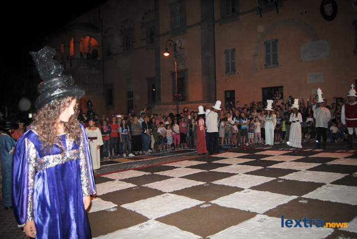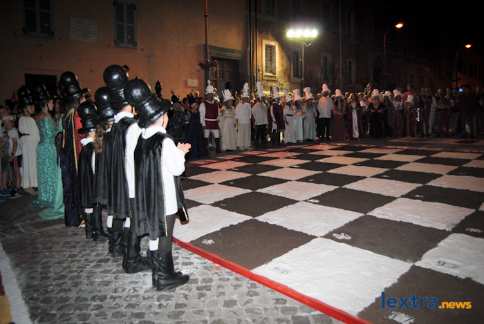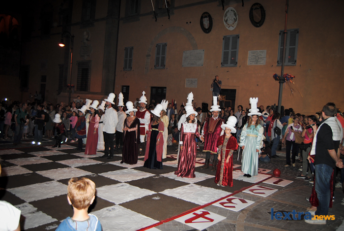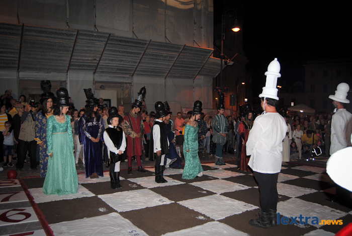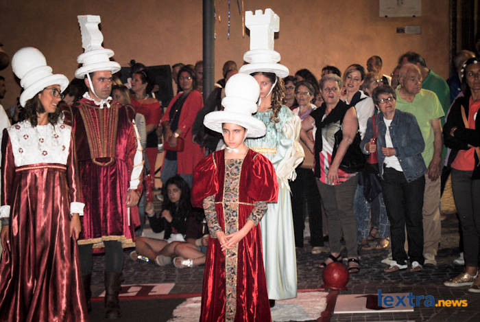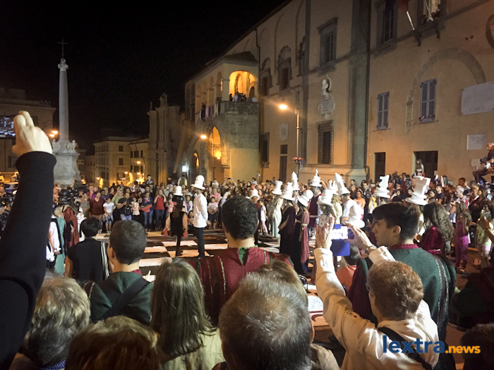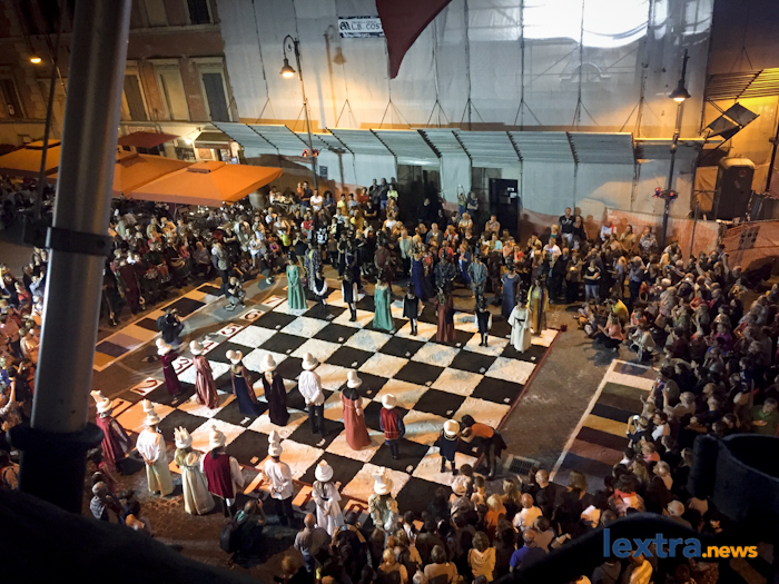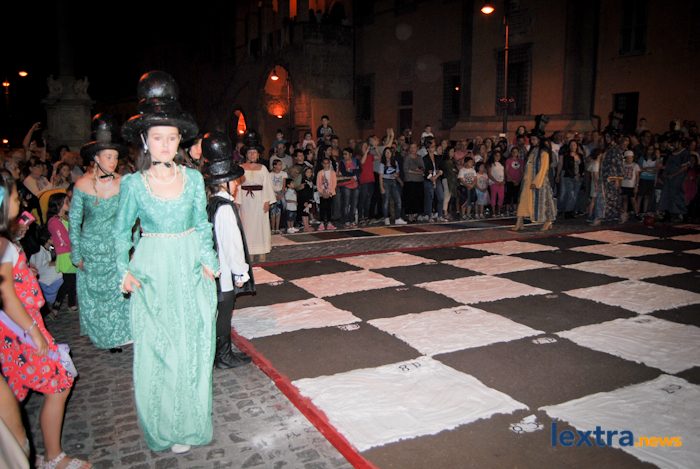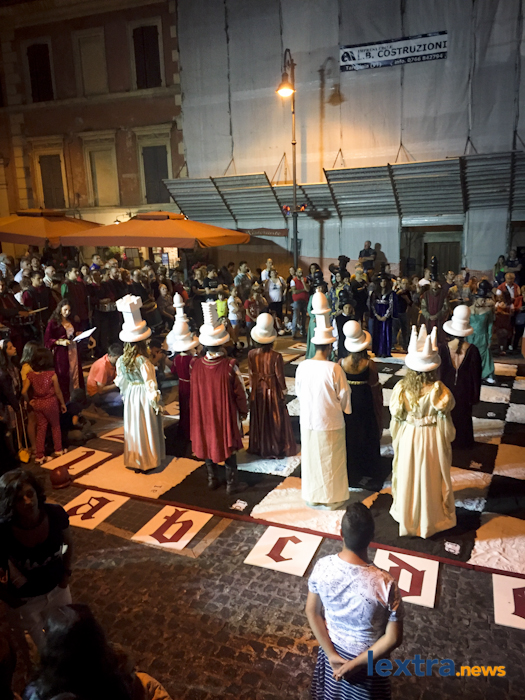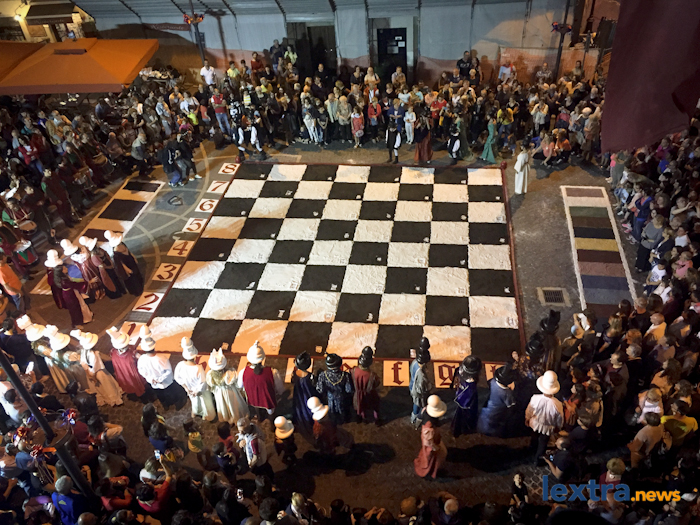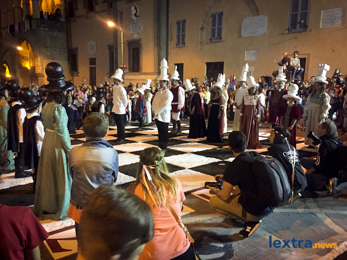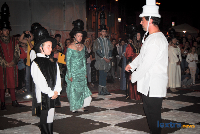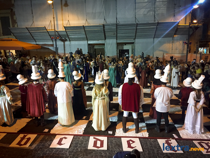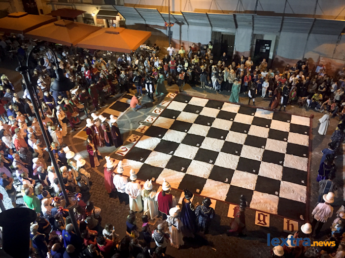 Il weekend tarquiniese della Giostra delle Contrade prosegue, in questo sabato sera, con l’inedita scacchiera vivente: mentre cresce l’attesa per il Palio di domani, si sono sfidati bianchi e neri sulla scacchiera di piazza Matteotti tra la curiosità dei presenti.