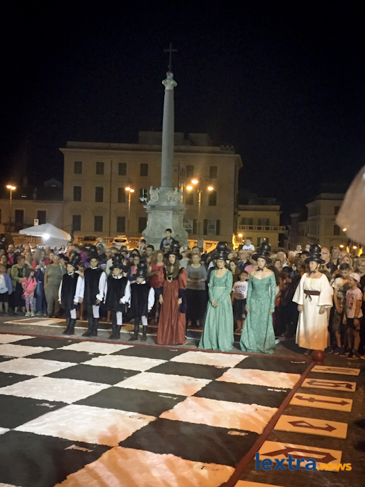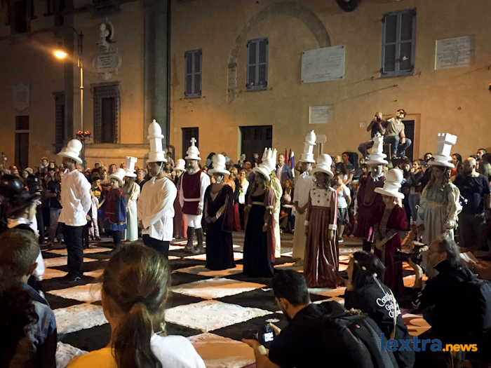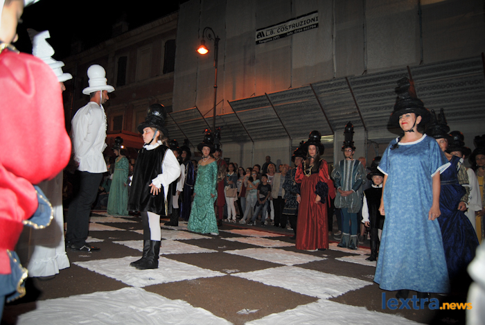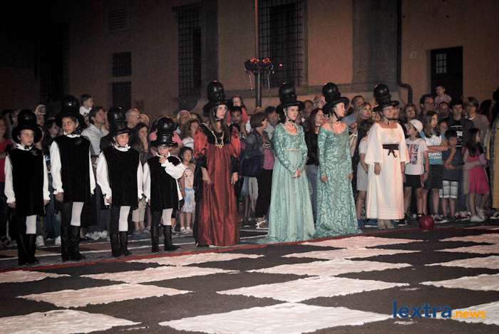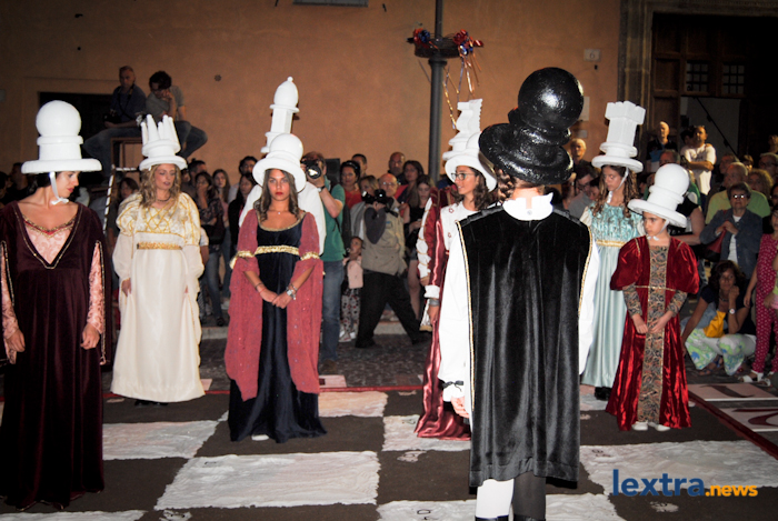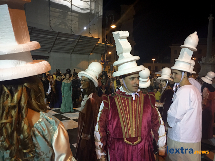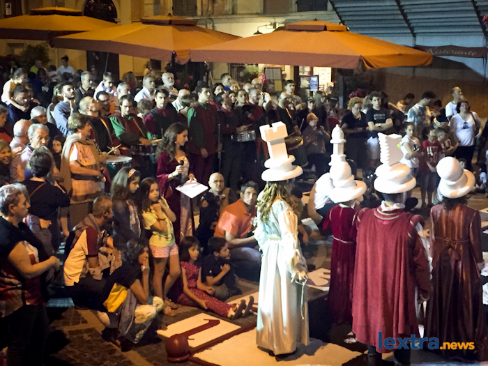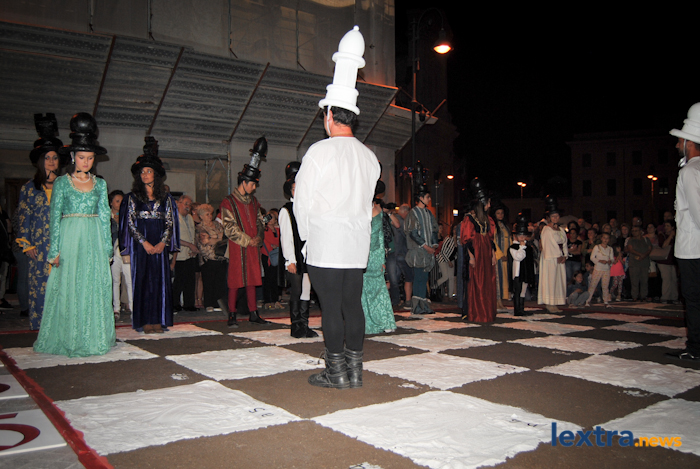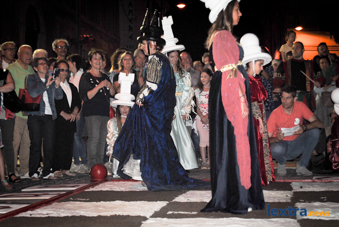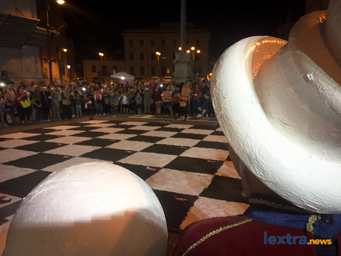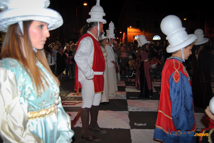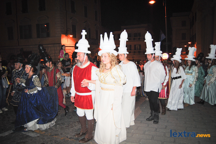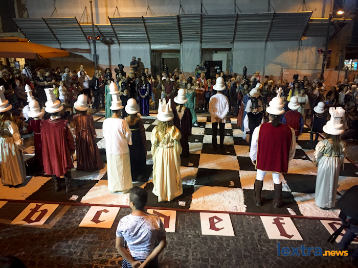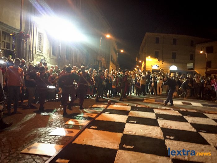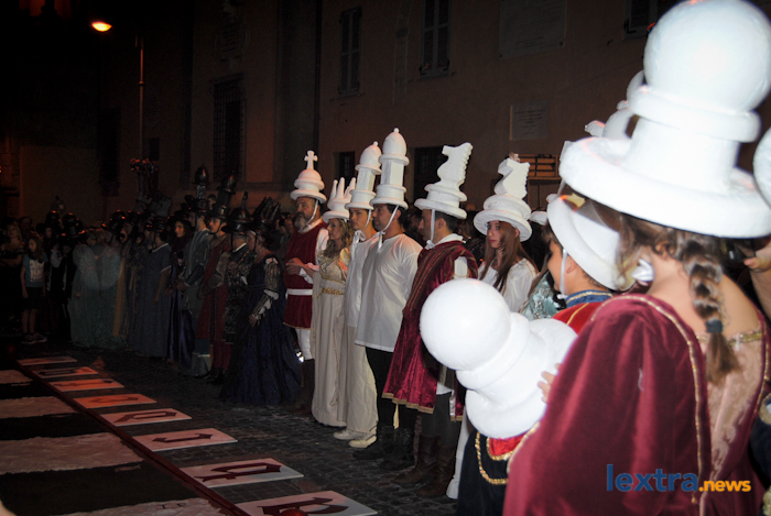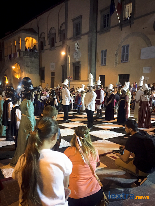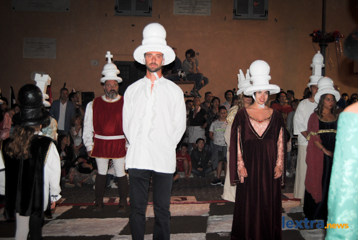 Il weekend tarquiniese della Giostra delle Contrade prosegue, in questo sabato sera, con l’inedita scacchiera vivente: mentre cresce l’attesa per il Palio di domani, si sono sfidati bianchi e neri sulla scacchiera di piazza Matteotti tra la curiosità dei presenti.