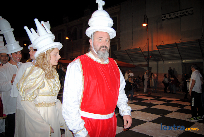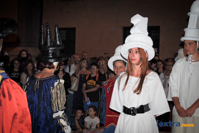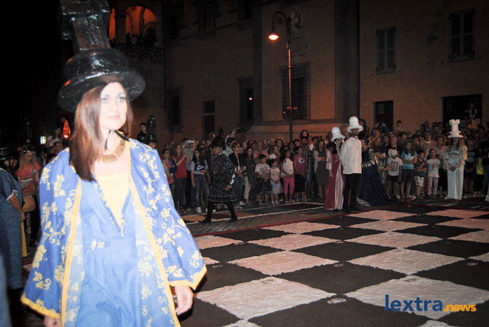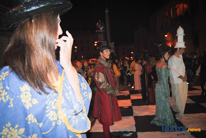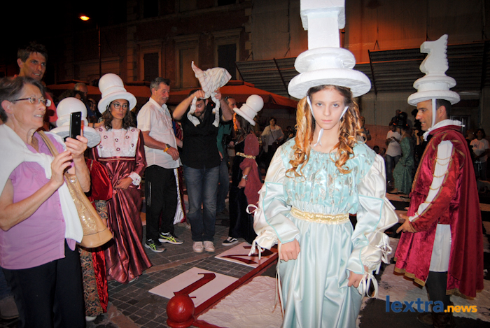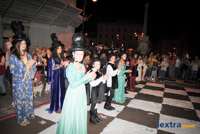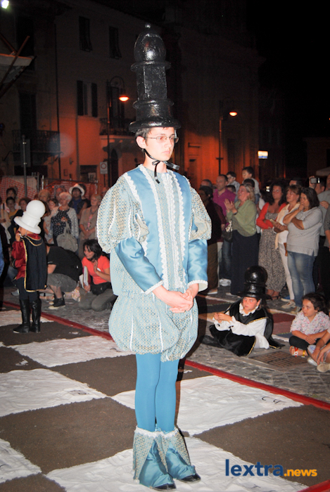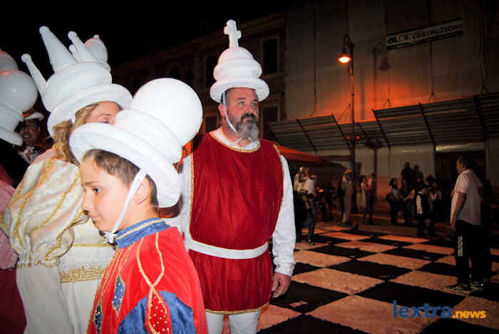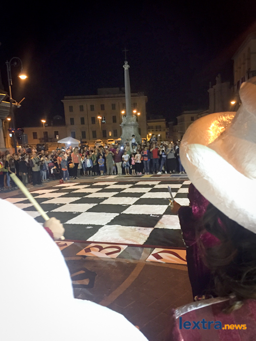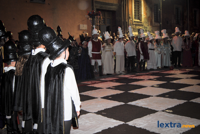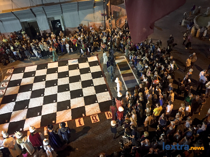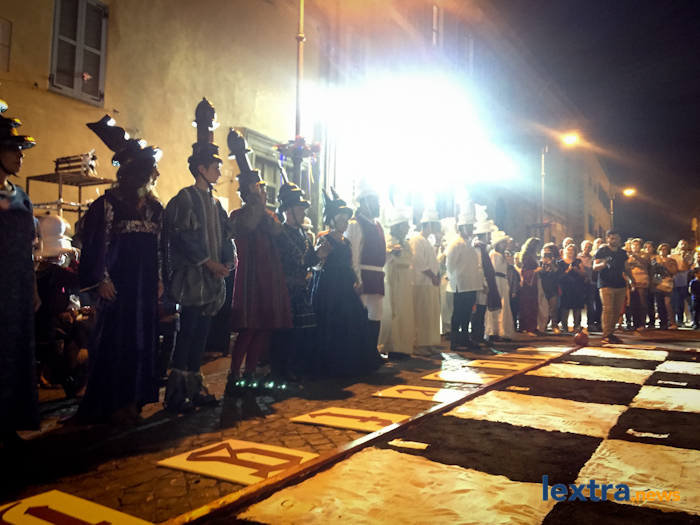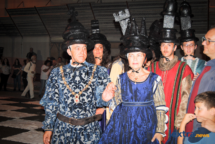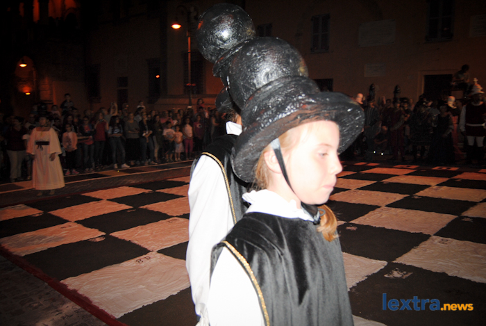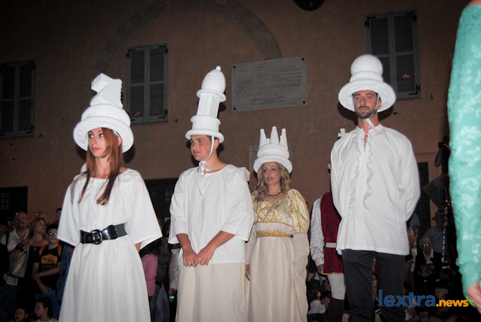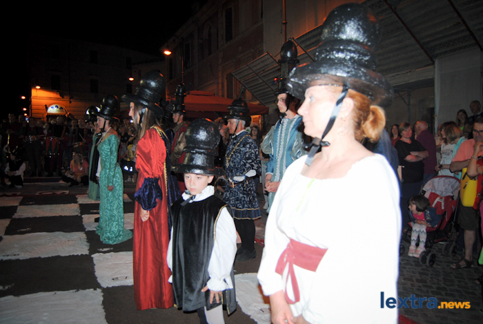 Il weekend tarquiniese della Giostra delle Contrade prosegue, in questo sabato sera, con l’inedita scacchiera vivente: mentre cresce l’attesa per il Palio di domani, si sono sfidati bianchi e neri sulla scacchiera di piazza Matteotti tra la curiosità dei presenti.